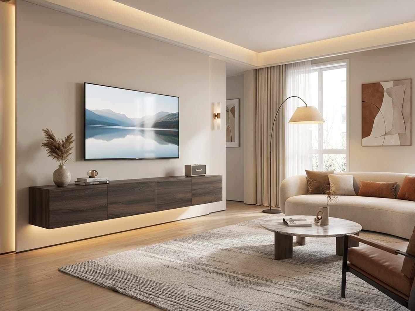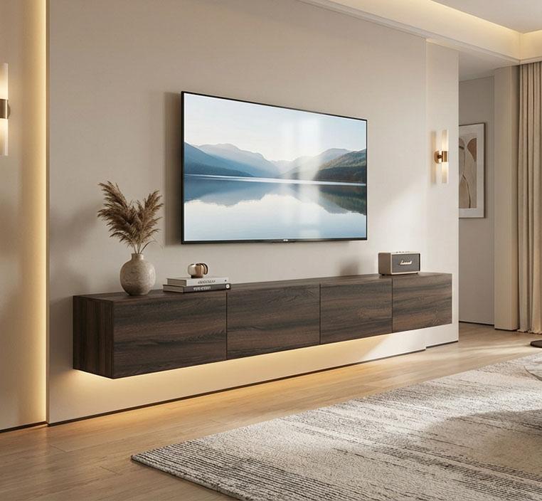 \nيشكّل هذا الدمج بين الطاولة والرف العلوي لوحة متوازنة تمنح الجدار حضورًا مميزًا وتحوّل زاوية التلفزيون إلى ركن جذاب يلفت الأنظار. ويمكن استخدام السطح لعرض قطع بسيطة، أو تركه بخطوطه الهادئة لمنح المكان طابعًا أكثر بساطة وأناقة.