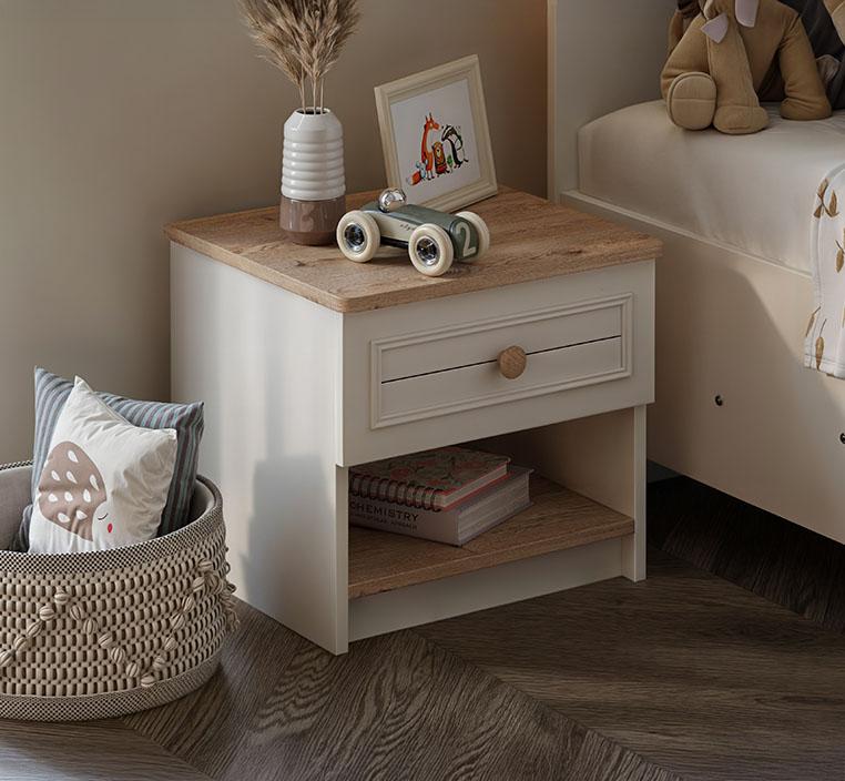 يتميز كمدينو بولو بلونه الأبيض النقي الذي يضفي على الغرفة إحساسًا بالنظافة والاتساع، بينما يضيف سطحه الخشبي الفاتح لمسة طبيعية دافئة تكمّل جمالية التصميم وتمنحه حضورًا هادئًا ومريحًا. هذا التباين بين الأبيض والخشب يجعل القطعة مناسبة لمختلف أنماط الديكور سواء كان مودرن، بسيط، أو حتى اسكندنافي.