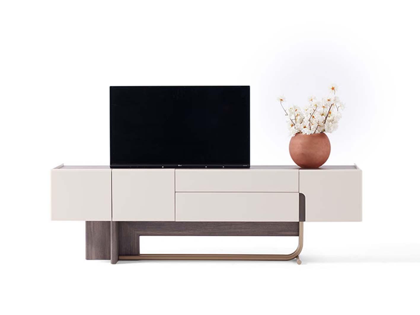 يتميز سطح طاولة التلفزيون بلون هادئ ولمسة ناعمة تتناغم بسلاسة مع أنماط الديكور المختلفة، سواء كان المودرن، المعاصر، أو الكلاسيكي العصري. تصميم الطاولة يجعلها قطعة محورية تضفي جواً من الرقي والتناغم على الغرفة، مع إبراز شاشة التلفزيون والإكسسوارات بطريقة منظمة وأنيقة.