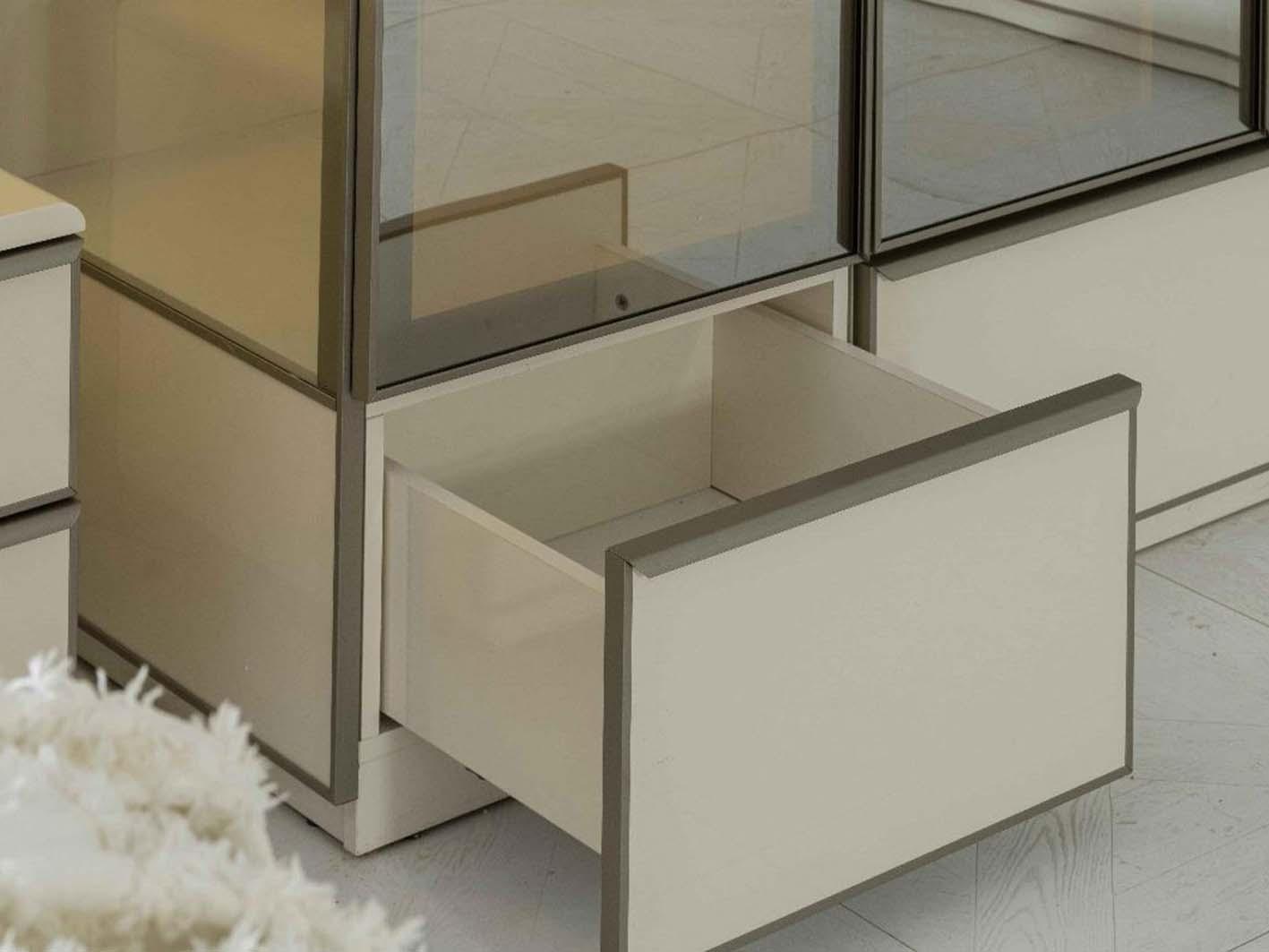 \nتم اختيار خامة الباموكلية بعناية فائقة لتوفير ملمس ناعم ومظهر فخم يدوم طويلاً، كما تم تعزيز الزجاج الشفاف ليكون متينًا وآمنًا، مع مقاومة للخدوش والصدمات الخفيفة. هذا التصميم العصري يسمح بتنظيم الملابس والإكسسوارات بطريقة مرتبة وواضحة، مع الحفاظ على شعور واسع ومساحة مفتوحة داخل الغرفة.