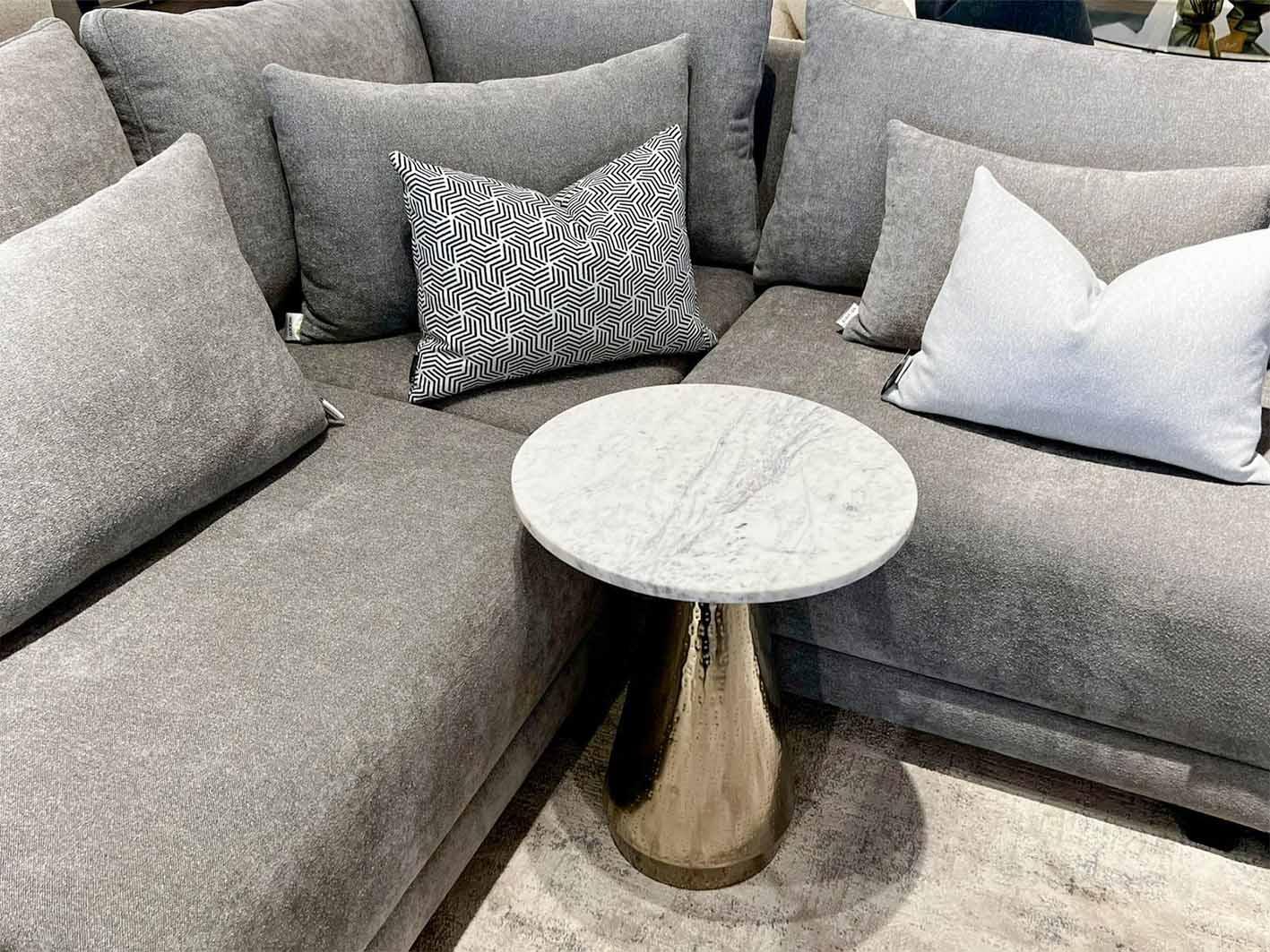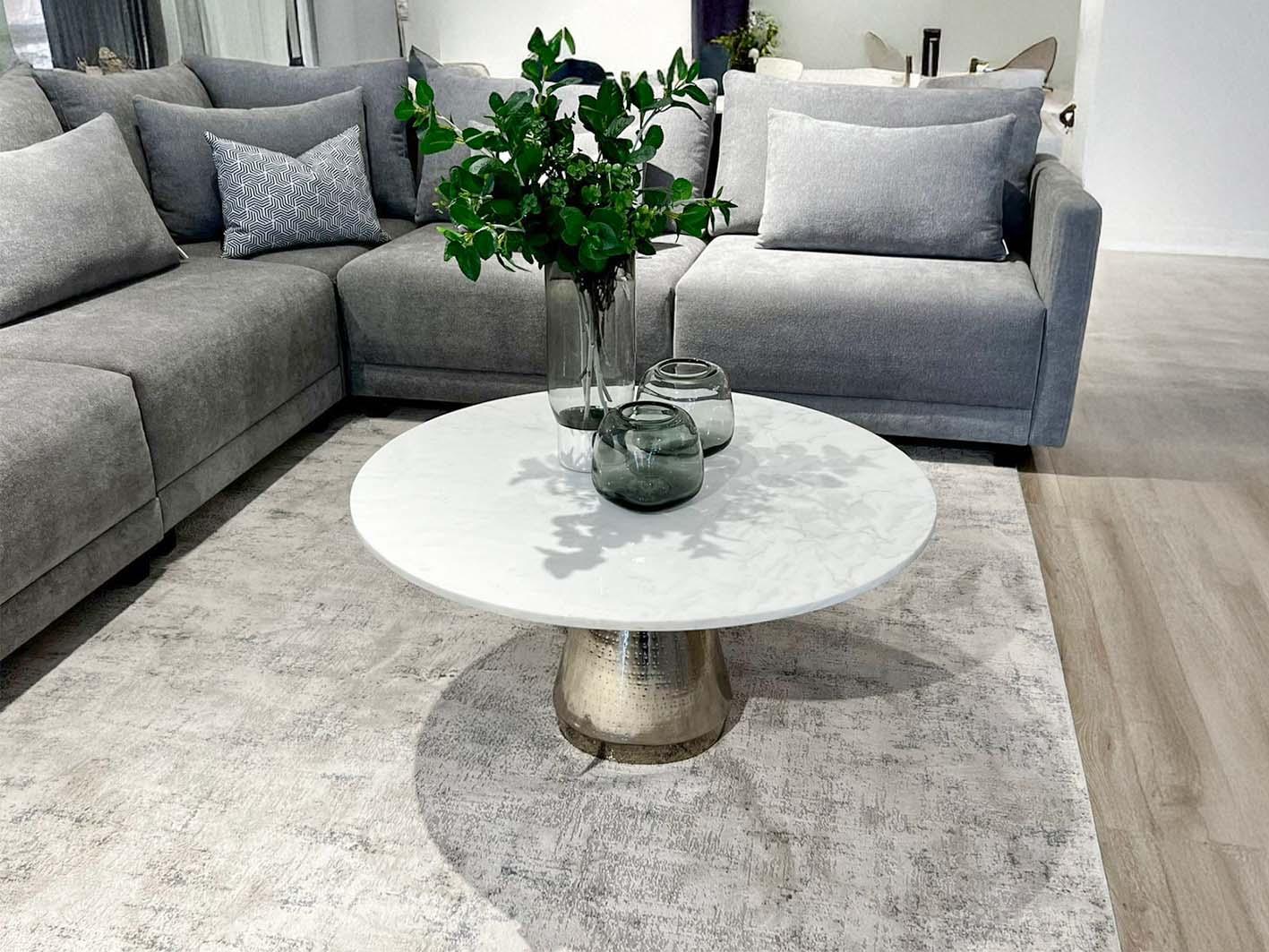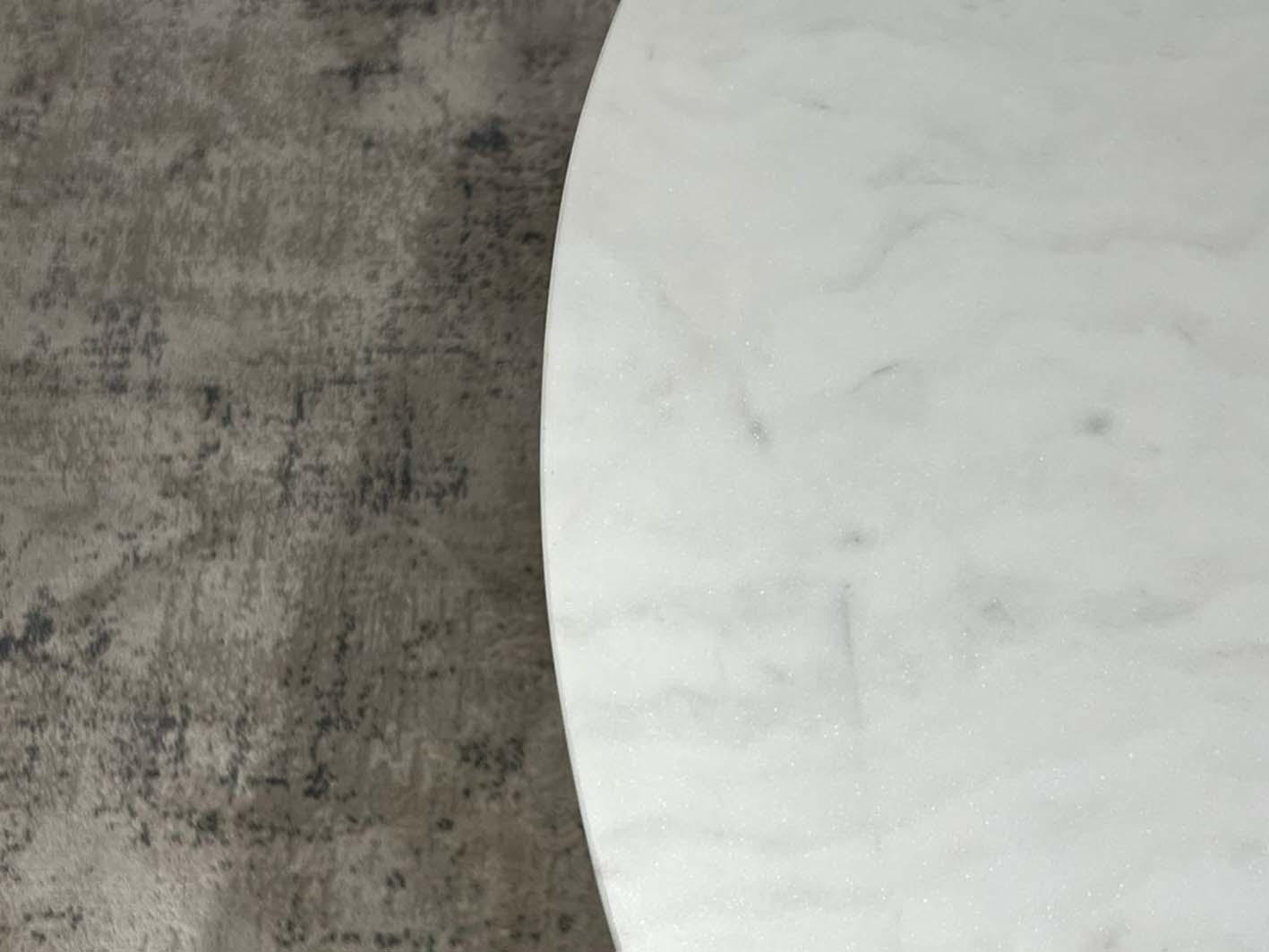 يعتمد التصميم على قاعدة معدنية دائرية بلون فضي لامع، تمنح الطاولات لمسة براقة تعكس الضوء بشكل أنيق، وتضفي بعدًا بصريًا جذابًا في أي مكان توضع فيه. تتسم القاعدة بشكلها الهندسي المتوازن وثباتها العالي، ما يضمن مزيجًا من المتانة والجمال.