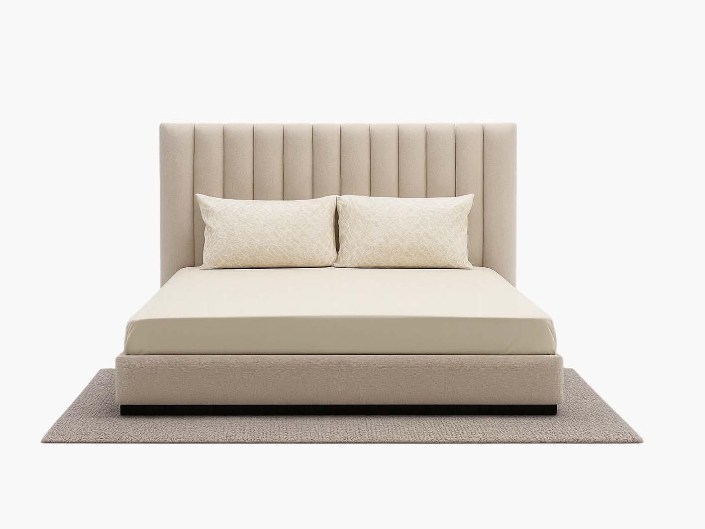 اللوح الخلفي المرتفع والمبطن بتصميمه الطولي الجذاب يمنح السرير حضورًا لافتًا ويعمل كعنصر ديكوري بارز. بالإضافة إلى ذلك، يوفّر دعمًا مريحًا لمن يفضل القراءة أو الاسترخاء قبل النوم. اللون الهادئ للتنجيد ينسجم بسهولة مع مختلف أنماط الديكور الداخلي، سواء كانت الغرفة بطابع كلاسيكي أو عصري.