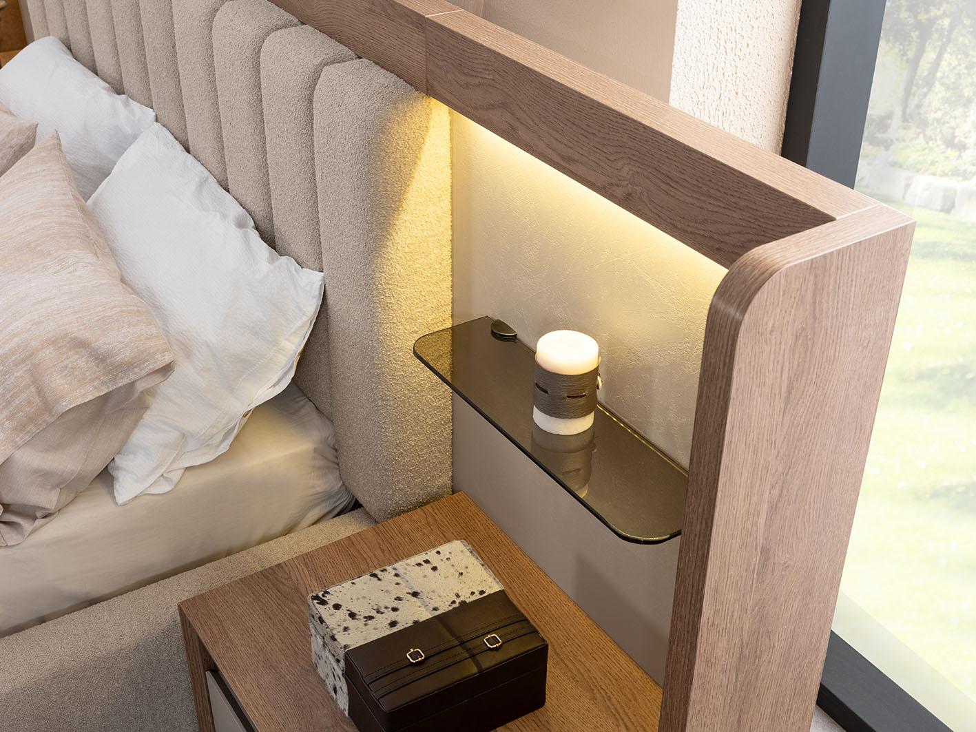 أرفف عرض التحف والديكور: واحدة من أبرز مميزات غرفة نوم لوجانو هي الأرفف المدمجة في اللوح الخلفي للسرير، والتي توفر مساحة مثالية لعرض تحفك الفنية المفضلة أو الكتب والإكسسوارات، مما يمنح الغرفة لمسة شخصية ومظهرًا أنيقًا ومرتبًا.