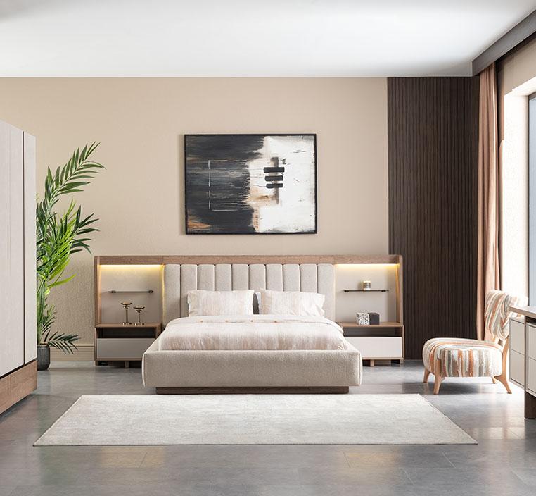 استمتع بأجواء من الفخامة والرقي مع طقم غرفة نوم لوجانو، المصمم خصيصًا ليجمع بين الأناقة والوظيفة في كل قطعة. يتميز السرير الرئيسي بحجم 180x200 بلمسات استثنائية حيث تم تنجيده بالقماش الفاخر الذي يضفي شعورًا رائعًا بالراحة والفخامة. يبرز اللوح الخلفي للسرير بوجود إضاءة مدمجة تضفي جوًا هادئًا ورومانسيًا، وتجعله نقطة تركيز أنيقة في الغرفة.
