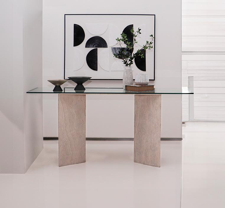 يأتي كونسول ليفربول بتصميم يجمع بين الأناقة والوظيفة العملية. يتكون سطحه العلوي من زجاج شفاف ومقوّى، مما يمنحه مظهرًا خفيفًا وعصريًا ويعكس الإضاءة بشكل جميل داخل المكان. كما يسهل تنظيف السطح الزجاجي ليبقى دائمًا بمظهره اللامع. أما القاعدة المصنوعة من الحجر الطبيعي فتمنح الكونسول لمسة فاخرة، مما يجعله خيارًا مثاليًا لمن يبحث عن طاولة مدخل تجمع بين الجمال والقوة.