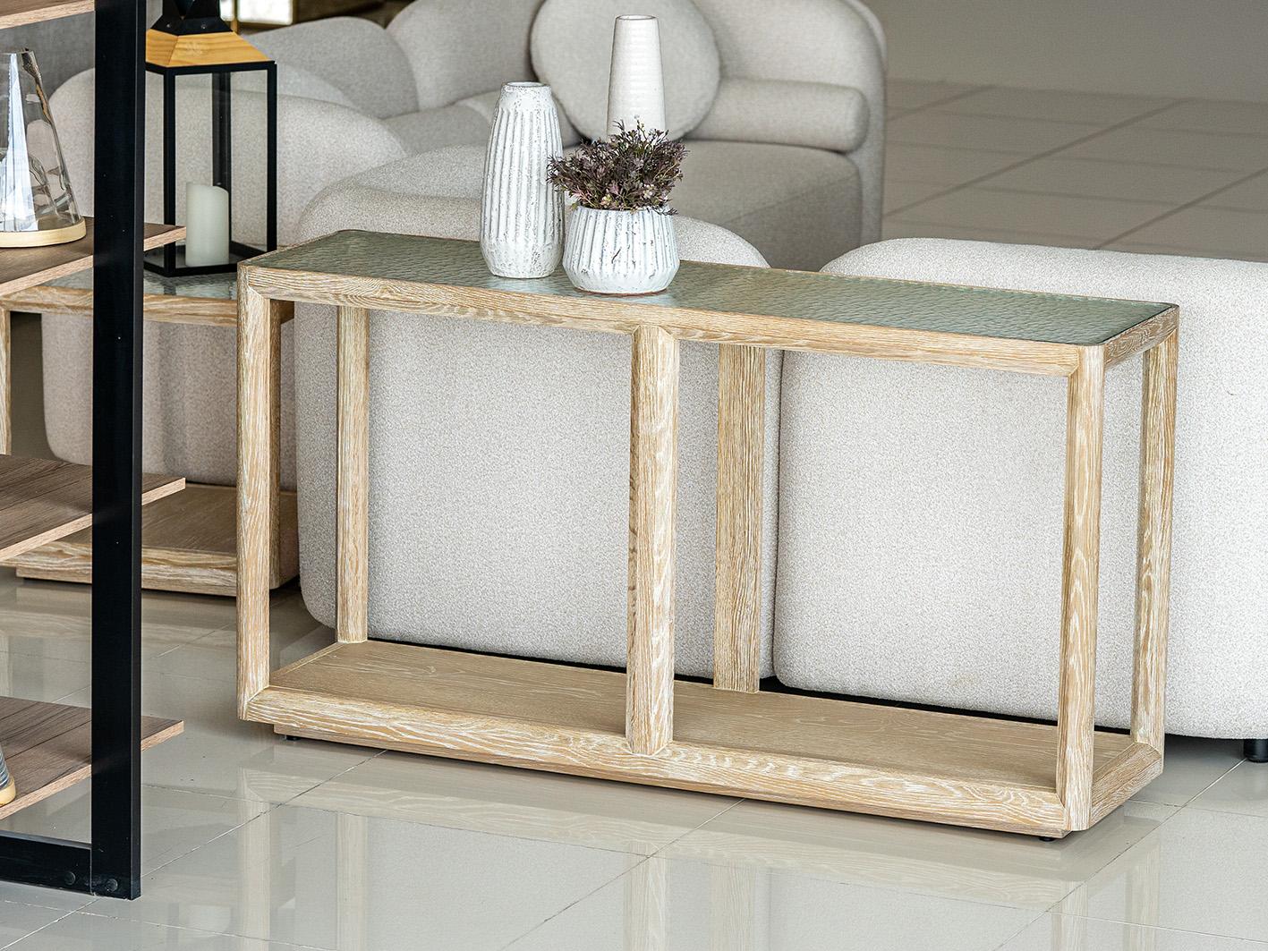 ما يميز هذا الكونسول عن غيره هو سطحه الزجاجي المموج، الذي يضيف لمسة من التميز والجمال إلى تصميمه. يعكس الزجاج المموج الضوء بشكل رائع ويعزز من إشراقة المكان، ليمنح طاولة مدخل مظهرًا فاخرًا وساحرًا. كما يتمتع السطح الزجاجي بمتانة عالية ويضفي لمسة عصرية على الأثاث التقليدي.