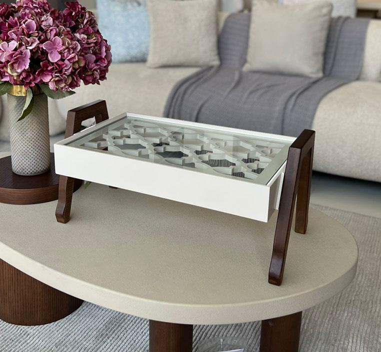 تم تصميم هذه الطاولة بعناية لتكون عنصرًا مثاليًا في غرفة المعيشة أو الجلوس، حيث يمكن استخدامها كطاولة تقديم أنيقة للقهوة أو الشاي عند استقبال الضيوف، أو كقطعة ديكور مركزية تزيّن طاولة القهوة بلمسة راقية. كما يمكن الاستفادة منها لتنسيق المزهريات، الشموع، أو الإكسسوارات المنزلية بطريقة مرتبة ومنسقة.