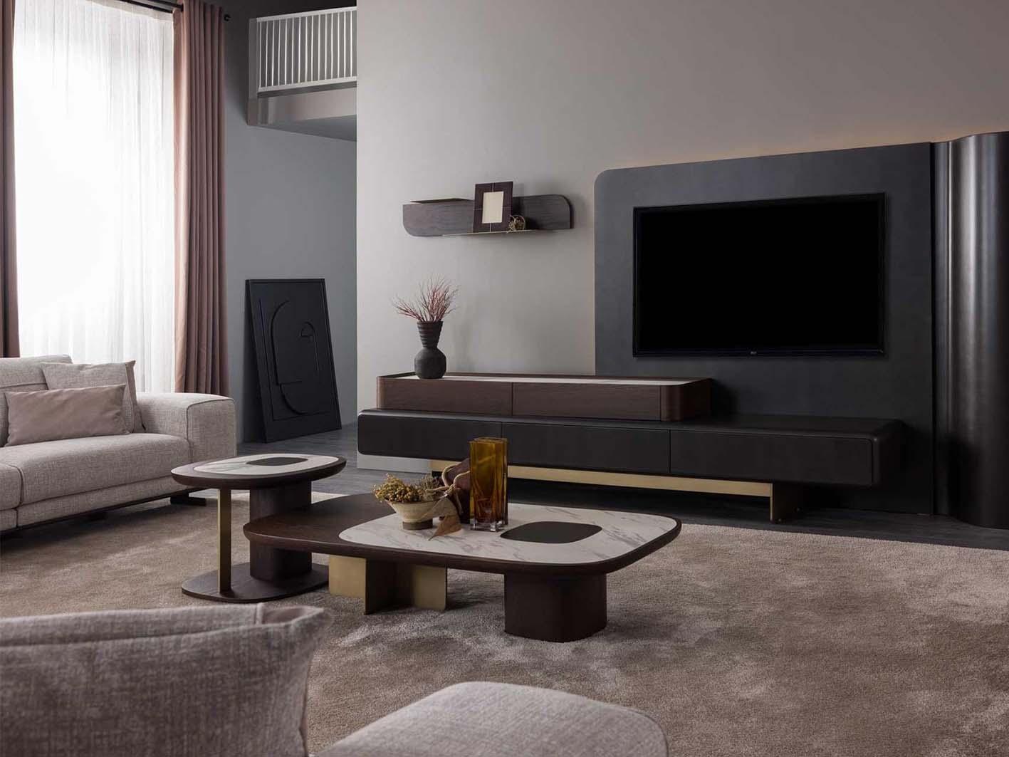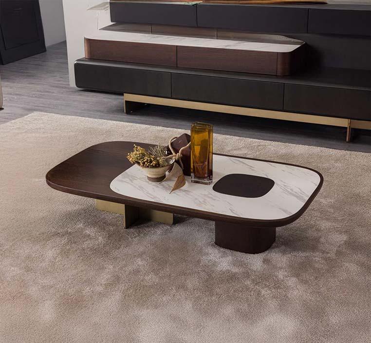 تتميز الطاولة بسطح واسع ذي زوايا ناعمة وانحناءات أنيقة تضفي طابعًا انسيابيًا ينسجم بسهولة مع مختلف أنماط الديكور، سواء العصري أو الكلاسيكي. يتوسط السطح لمسة جمالية من الرخام الصناعي بلون أبيض مع تموجات رمادية جذابة، تنقسم بانسيابية مع الخشب الغني بلونه الداكن، مما يخلق تباينًا بصريًا فريدًا. كما تضيف القطعة الدائرية الصغيرة ذات اللون الداكن لمسة فنية تكمّل التصميم الراقي.