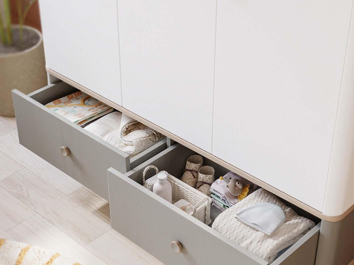 أدراج سفلية مدمجة: يأتي دولاب بونو مزودًا بدرجين كبيرين في الجزء السفلي، حيث يمكنك تخزين الأغراض التي تفضل الوصول إليها بسهولة، مثل الأوشحة والأحذية والمستلزمات الشخصية الصغيرة، مما يتيح لك ترتيب دولابك بطرق تناسب احتياجاتك.