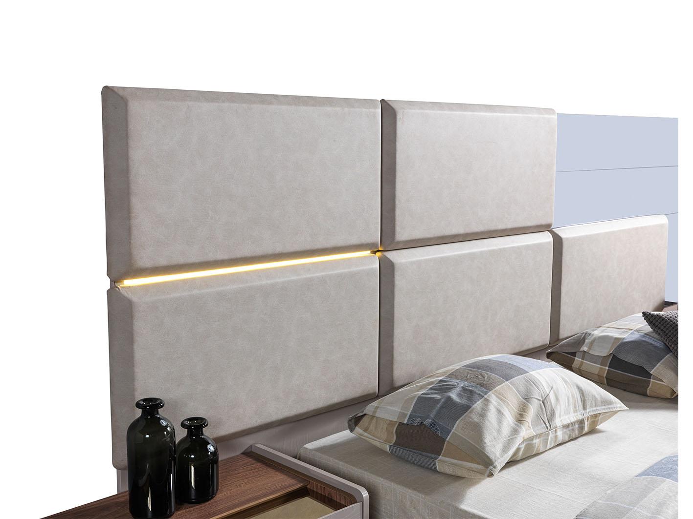 تمتاز غرفة نوم بيرو بسرير مزدوج منجد بالقماش الفاخر عالي الجودة، ما يضفي لمسة راقية ويوفر أقصى درجات الراحة. يزين اللوح الرأسي للسرير بإضاءة LED عصرية تضيف لمسة دافئة وساحرة إلى الغرفة، إلى جانب تفاصيل زجاجية أنيقة تعزز من فخامتها.