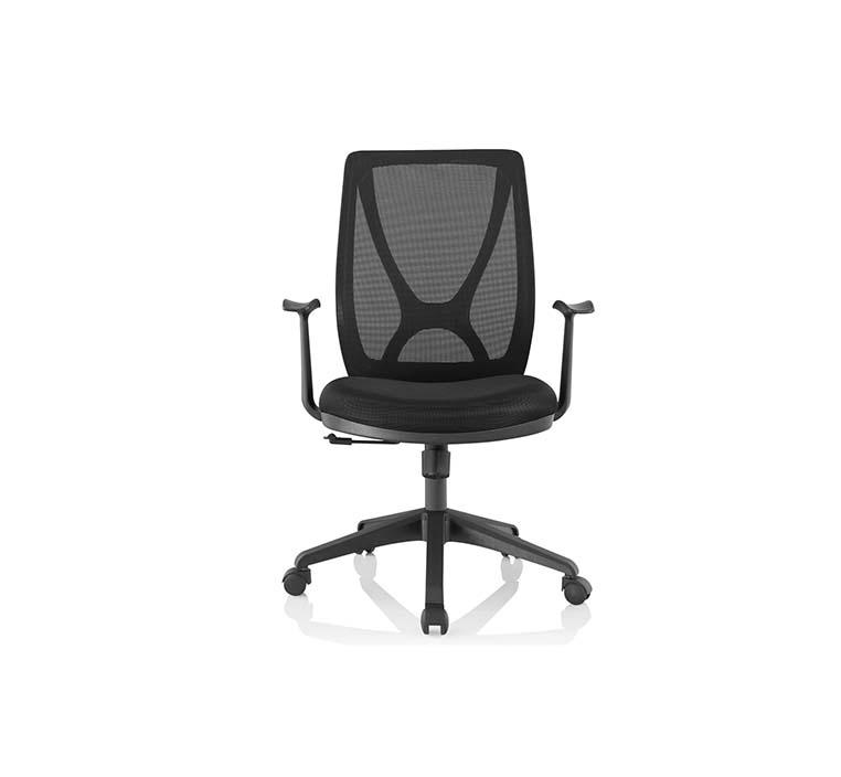 يتميز الكرسي بمزيج أنيق من اللون الاسود، مما يمنحه مظهراً عصريًا وجذابًا يناسب المكاتب الراقية والمساحات العصرية. الهيكل مصنوع من بلاستيك قوي ، بينما يأتي مسند الظهر الشبكي باللون الأسود لتوفير تهوية مثالية وراحة مستمرة.