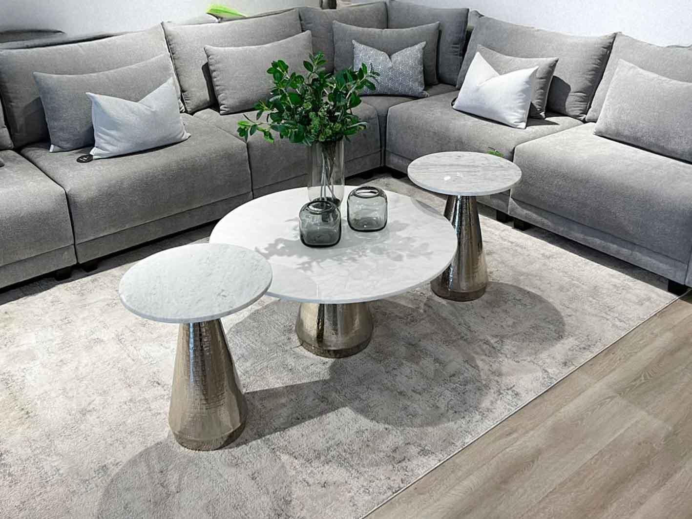 يعتمد التصميم على قاعدة معدنية دائرية بلون فضي لامع، تمنح الطاولات لمسة براقة تعكس الضوء بشكل أنيق، وتضفي بعدًا بصريًا جذابًا في أي مكان توضع فيه. تتسم القاعدة بشكلها الهندسي المتوازن وثباتها العالي، ما يضمن مزيجًا من المتانة والجمال.
