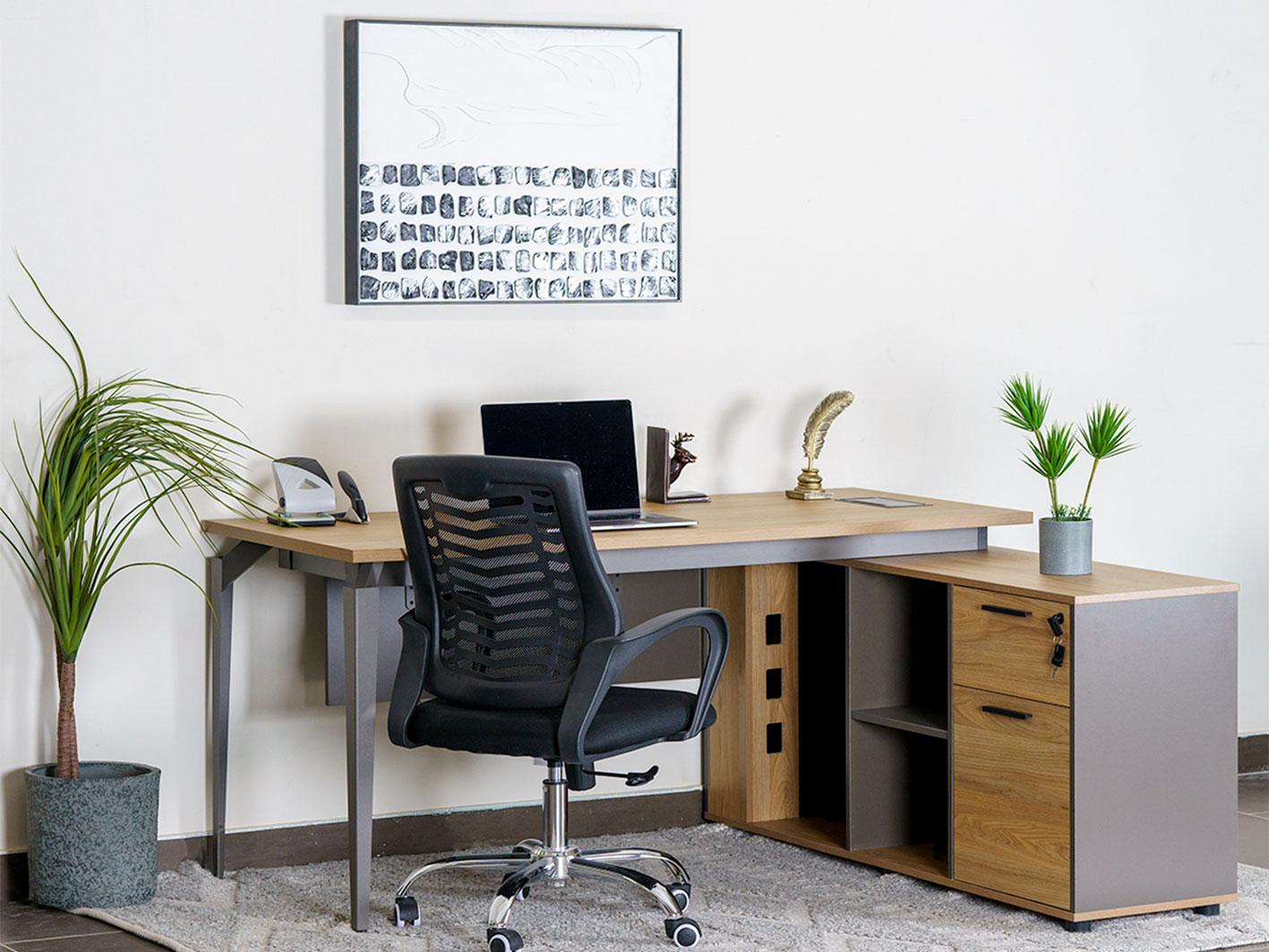 ألوان هادئة ومريحة: مزيج الخشبي والرمادي يوفر جوًا مريحًا يساعد على التركيز والإبداع في العمل.