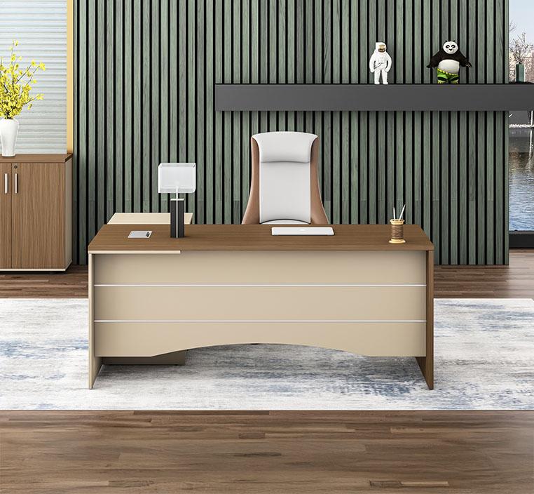 تم تصنيع المكتب باستخدام لوح خشبي صديق للبيئة من الدرجة E1 مع تشطيب ميلامين مستورد من علامة "Schattdecor"، لضمان مقاومة الخدوش والتآكل. يتميز المكتب بحواف PVC متينة بسُمك 2 ملم على السطح العلوي و1.2 ملم على الجوانب. السطح العلوي بسمك 25 ملم يمنح المكتب متانة فائقة تجعله مثاليًا للاستخدام اليومي المكثف.