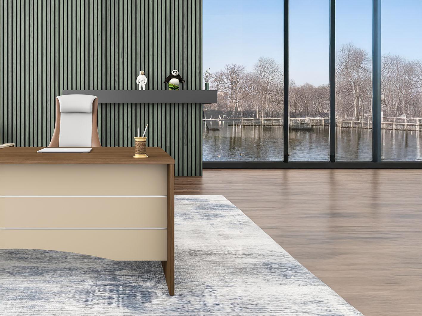 تم تصنيع المكتب باستخدام لوح خشبي صديق للبيئة من الدرجة E1 مع تشطيب ميلامين مستورد من علامة "Schattdecor"، لضمان مقاومة الخدوش والتآكل. يتميز المكتب بحواف PVC متينة بسُمك 2 ملم على السطح العلوي و1.2 ملم على الجوانب. السطح العلوي بسمك 25 ملم يمنح المكتب متانة فائقة تجعله مثاليًا للاستخدام اليومي المكثف.