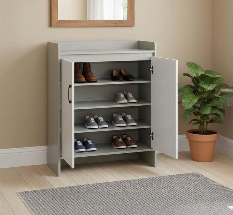 يحتوي الدولاب على بابين عمليين يساعدان في إخفاء الأحذية والحفاظ على ترتيب المكان. يوفر التصميم الداخلي مساحة مناسبة لترتيب الأحذية بشكل منظم، سواء للأحذية اليومية أو الرسمية. يساعد هذا التنظيم على تسهيل الوصول للأحذية بسرعة، ويقلل من الفوضى في المدخل أو الغرفة.