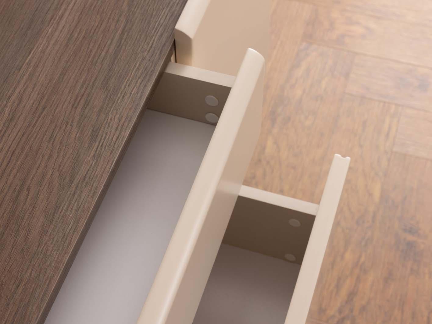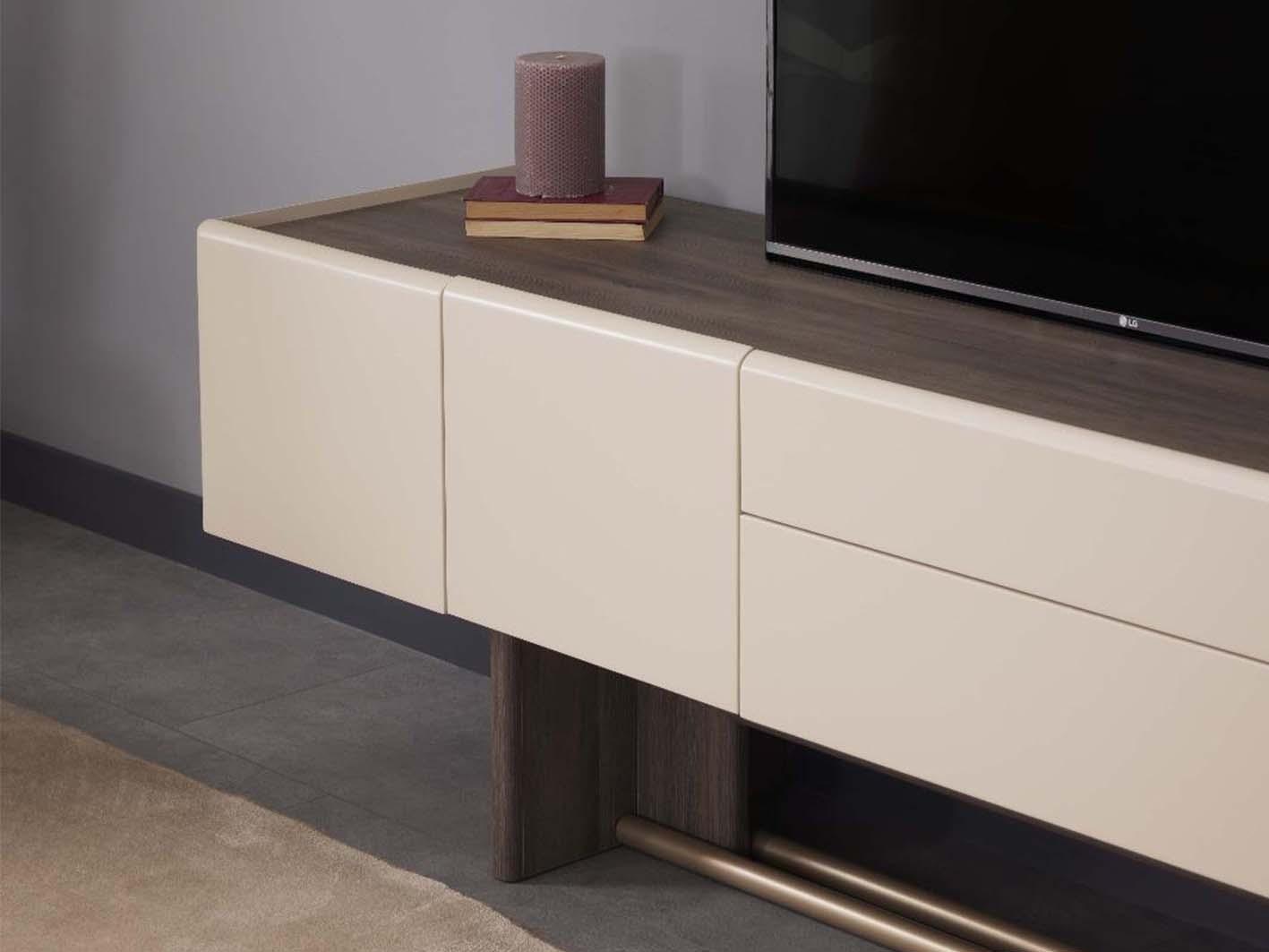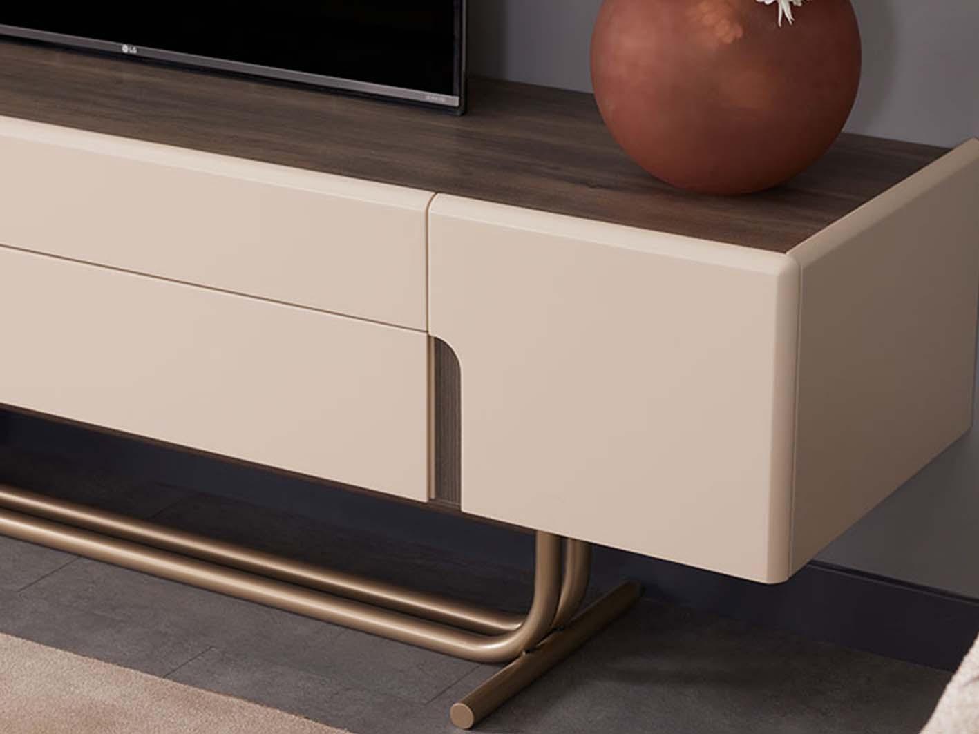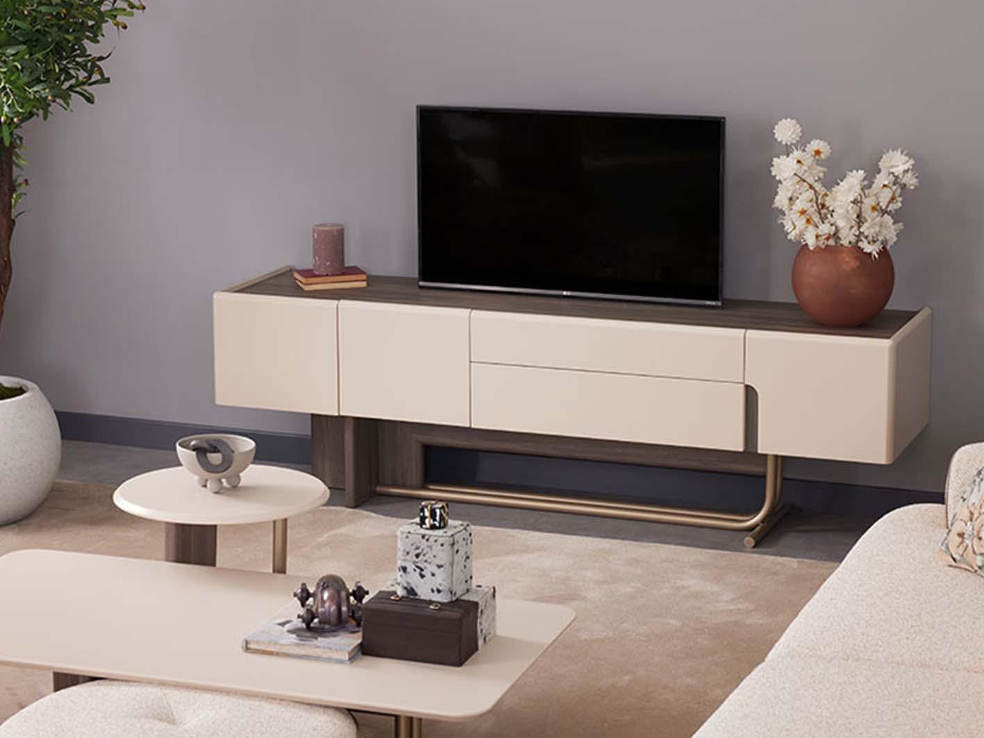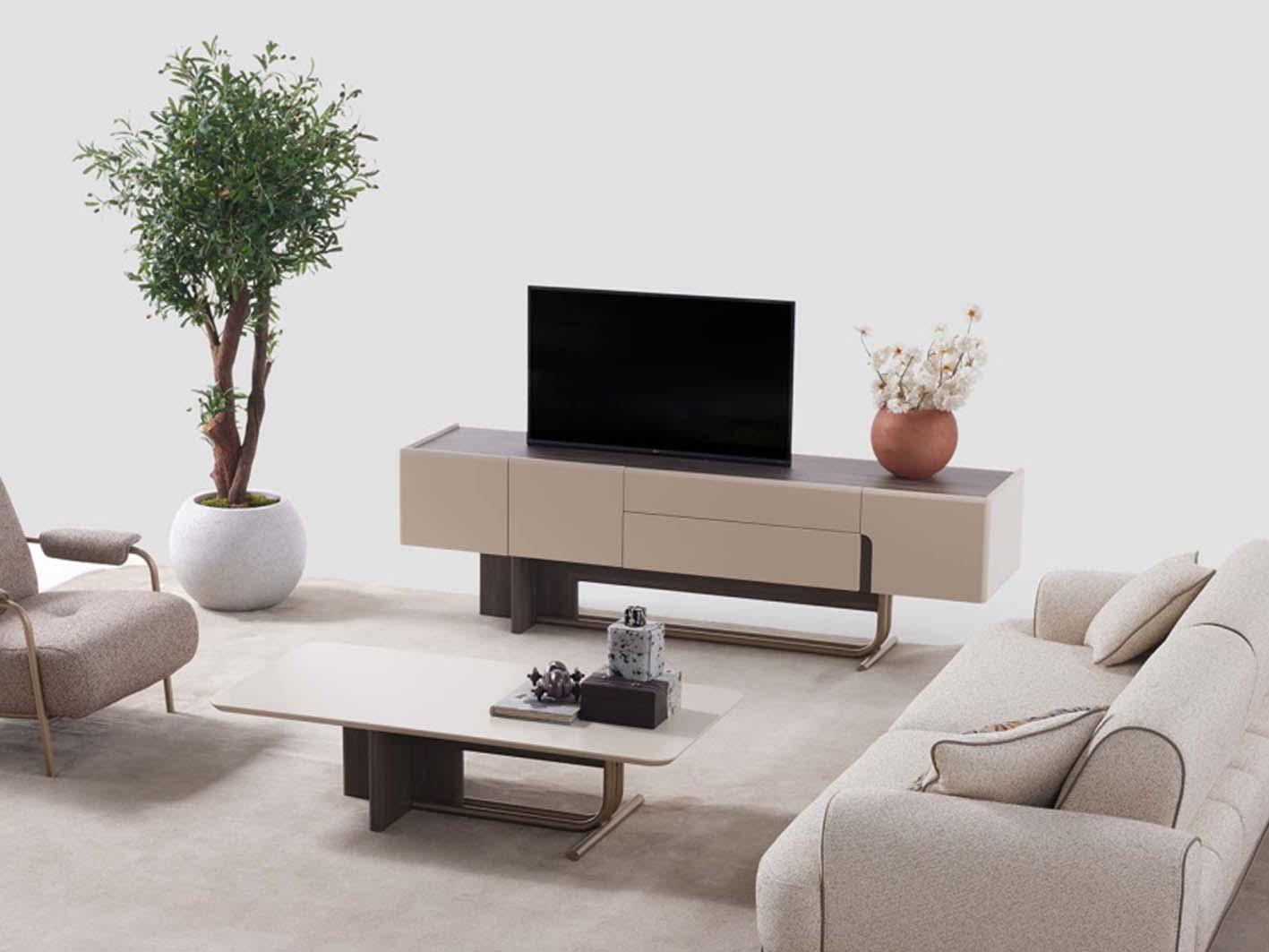 يتميز سطح طاولة التلفزيون بلون هادئ ولمسة ناعمة تتناغم بسلاسة مع أنماط الديكور المختلفة، سواء كان المودرن، المعاصر، أو الكلاسيكي العصري. تصميم الطاولة يجعلها قطعة محورية تضفي جواً من الرقي والتناغم على الغرفة، مع إبراز شاشة التلفزيون والإكسسوارات بطريقة منظمة وأنيقة.