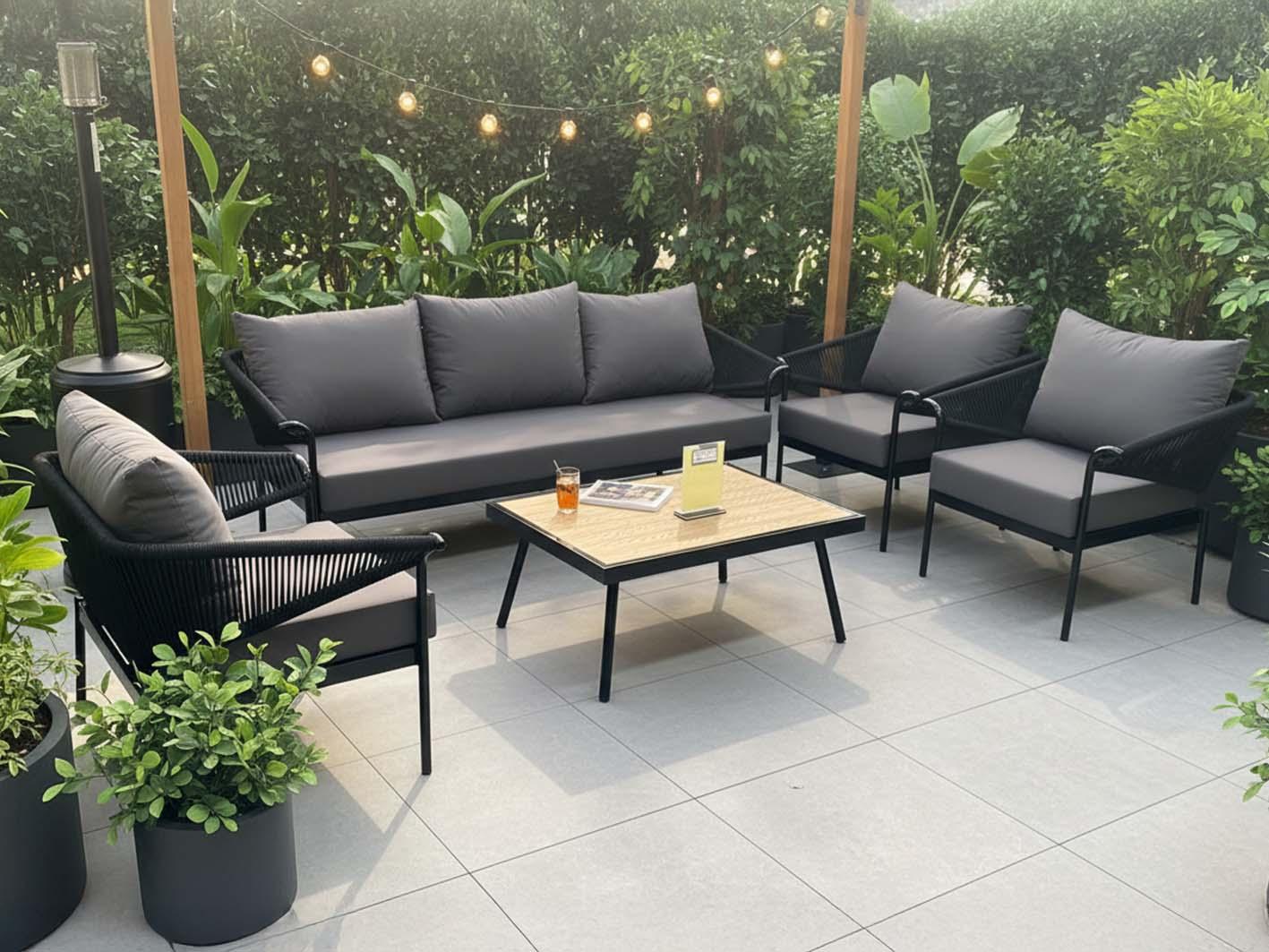 يمثل هذا الطقم مزيجًا متقنًا من الراحة والجمال والمتانة، حيث يجمع بين وسائد ناعمة، وأقمشة قابلة للتنفس، وهياكل متينة تعزز ثبات الجلسة على مختلف الأسطح الخارجية. كما يتسم التصميم المودرن بخطوط نظيفة تشكل إضافة راقية لأي مساحة، مع إدخال لمسات طبيعية تضفي إحساسًا بالدفء والانسجام.