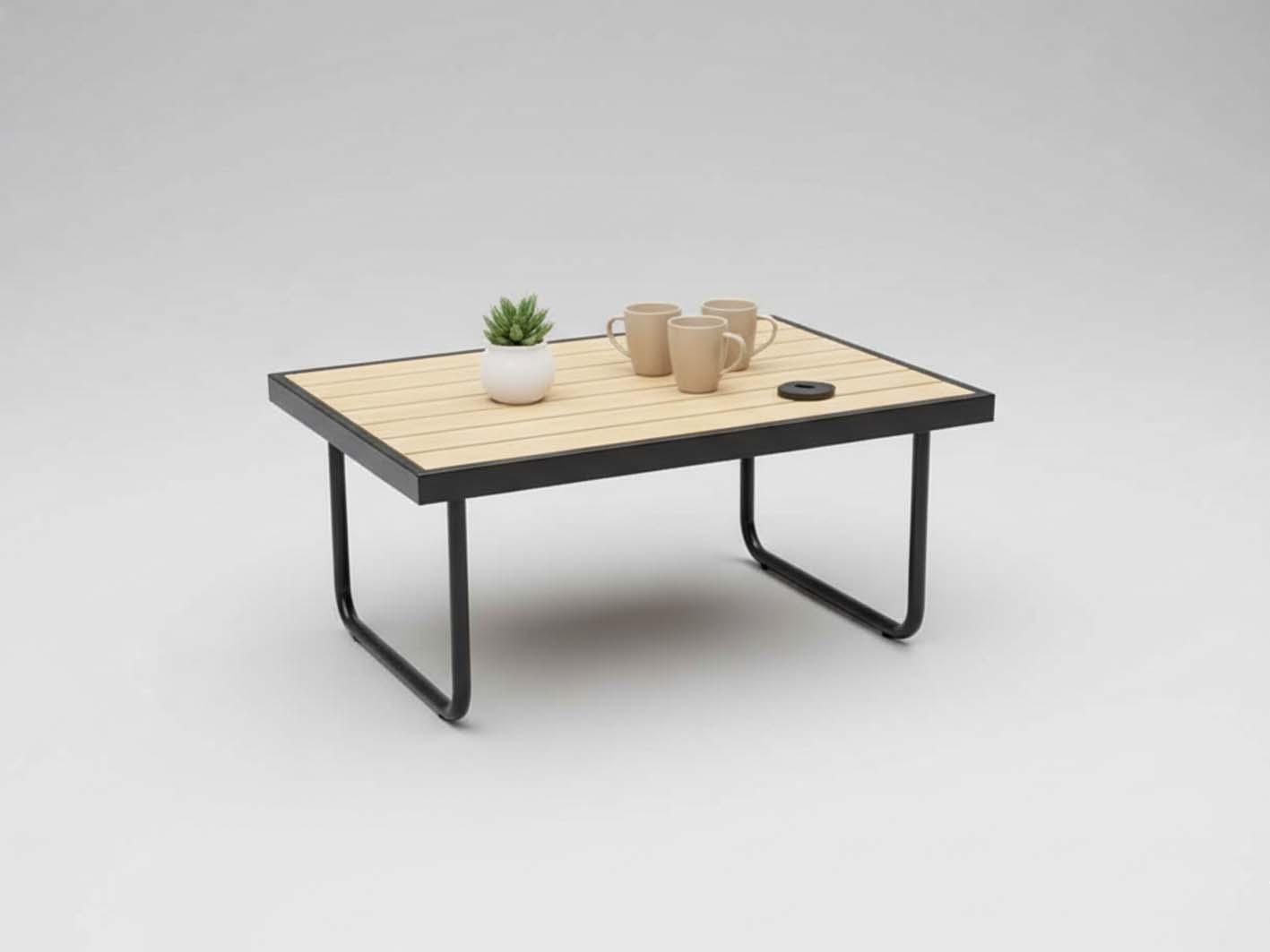 تأتي الطاولة بتصميم أنيق بسطح بلون خشبي فاتح يمنح الجلسة مظهرًا دافئًا وطبيعيًا، ويضيف لمسة من التباين الجميل مع الهيكل الرمادي. السطح الخشبي سهل التنظيف ومقاوم للخدوش، مما يجعله مثاليًا لوضع المشروبات والوجبات الخفيفة والإكسسوارات الخارجية.