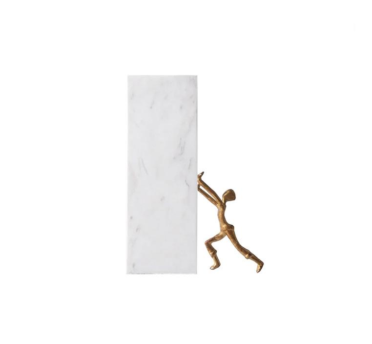 أضف لمسة من الأناقة والرقي إلى مساحتك المنزلية مع هذه التحفة الرائعة,تبرز هذه التحفة الفنية جماليات التصميم البسيط والراقي، مع دمج مواد متناقضة مثل المعدن والرخام ,حيث تظهر رجلا من المعدن الذهبي يدفع جدارا من الرخام الأبيض. يمكن استخدامها كقطعة فنية لتزين الارفف الديكورية أو قطعك المنزلية وكذلك يمكن أستخدامها كمسند لتنظيم كتبك المختلفة.