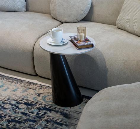 جملي اثاث غرفة معيشتك بطاولة خدمة زجنا الرائعة , تتميز الطاولة بمظهر استثنائي حيث تأتي بقاعدة معدنية علي شكل مخروط يجعلها ذات رونق خاص بالاضافة سطحها الدائري الرخامي الناعم الذي يجعلها سهلة التنظيف والعناية . الطاولة مصنوعة من خامات عالية الجودة مما يضمن لها الاستدامة والتحمل .