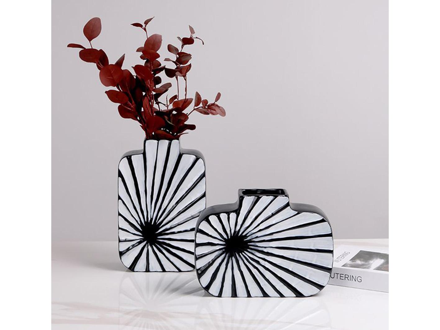 استمتع بإضافة هذه المزهرية الفريدة والأنيقة إلى تصاميمك الداخلية.تصميمها المميز من السيراميك المزخرف باللون الابيض والاسود سيضفي لمسة من الأناقة على أي غرفة. تعمل بساطة التصميم والتباين في الألوان على خلق جو جذاب ومهدئ للعين. يتيح لك التنوع في استخدامها وضعها في مختلف البيئات، من غرف المعيشة إلى مناطق تناول الطعام، مما يجعلها إضافة متعددة الاستخدامات لأي منزل.