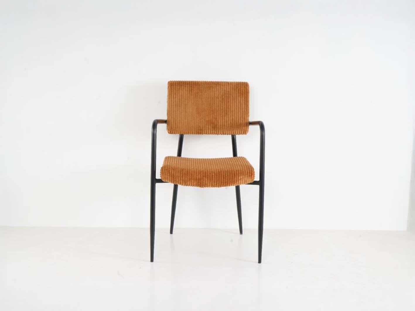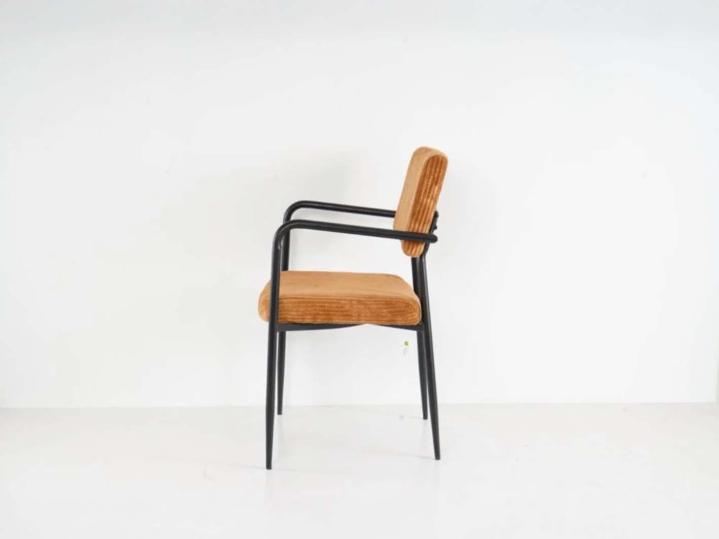 الإطار المعدني باللون الأسود يمنح الكرسي ثباتًا ومتانة، كما تضيف الأذرع الرفيعة تصميمًا عمليًا دون أن تثقل الشكل العام. الكرسي خفيف الوزن وسهل الحركة، مما يتيح تنقله بين الغرف حسب الحاجة دون عناء.
