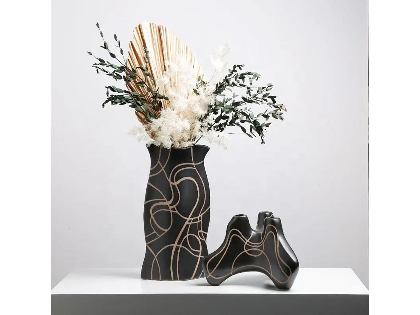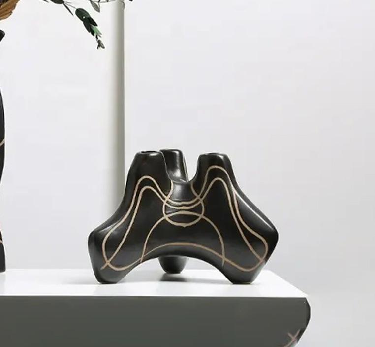 تضفي هذه الفازة السوداء الأنيقة جمالية استثنائية على أي مساحة داخلية بفضل تصميمها العصري والفريد. تتميز بتفاصيلها الدقيقة والخطوط الذهبية التي تزينها، مما يجعلها قطعة فنية رائعة تناسب أي ديكور منزلي، سواء كان كلاسيكيا أو حديثا.يمكن استخدامها كقطعة ديكور منفردة أو مع أزهار جافة أو اصطناعية.