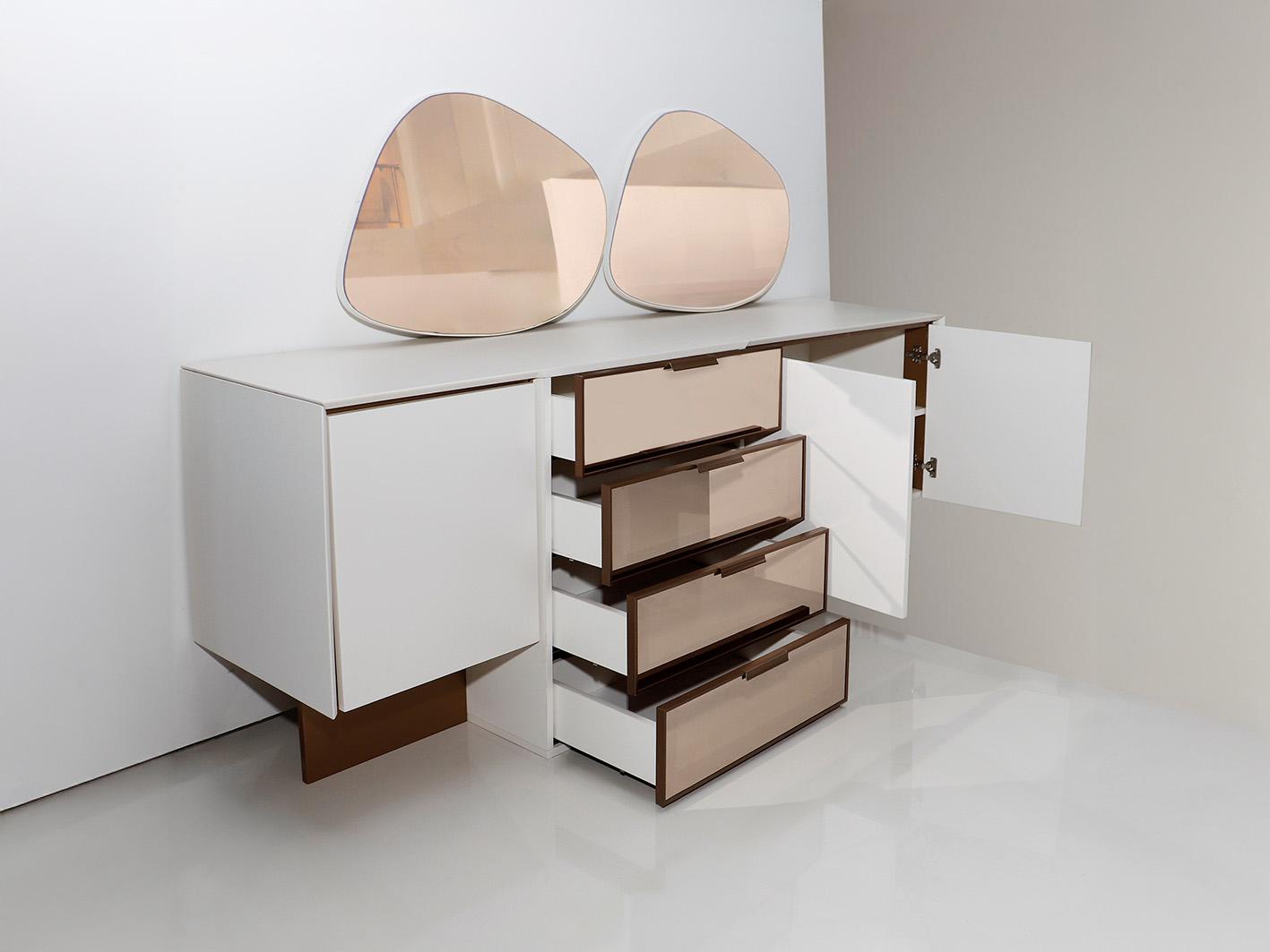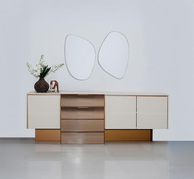 2. مرآتان غير تقليديتين: يتميز الكونسول بوجود مرآتين فريدتين في تصميمهما، مما يضفي لمسة فنية على القطعة. تأتي المرآتان بأشكال غير تقليدية، مما يجعلها نقطة جذب بصرية في الغرفة، حيث تعمل على تكبير المساحة وإضافة لمسة من العمق والإشراق.