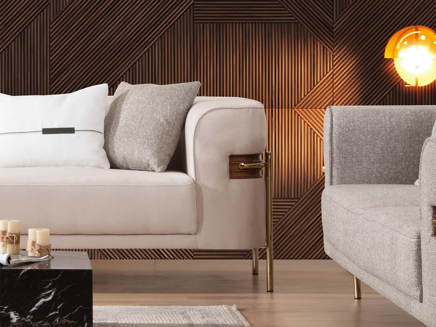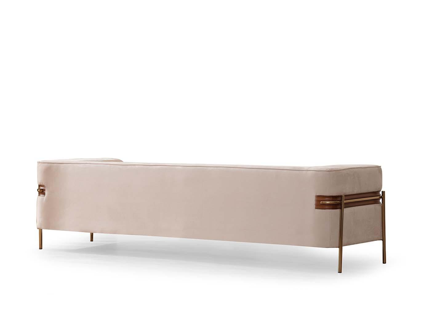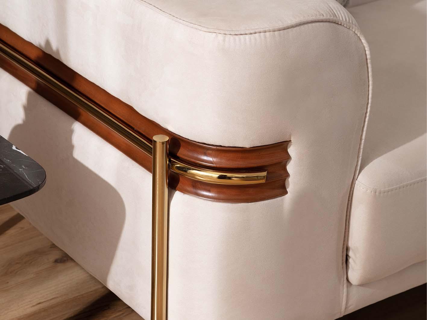 تم تصنيع الإطار من خامة Plywood عالية الجودة مدعومة بفولاذ مغطى بالذهب يمنحه متانة استثنائية ومظهرًا فاخرًا. هذه المواد تضمن عمرًا طويلًا للكنب مع الحفاظ على ثباته وأناقة خطوطه العصرية.