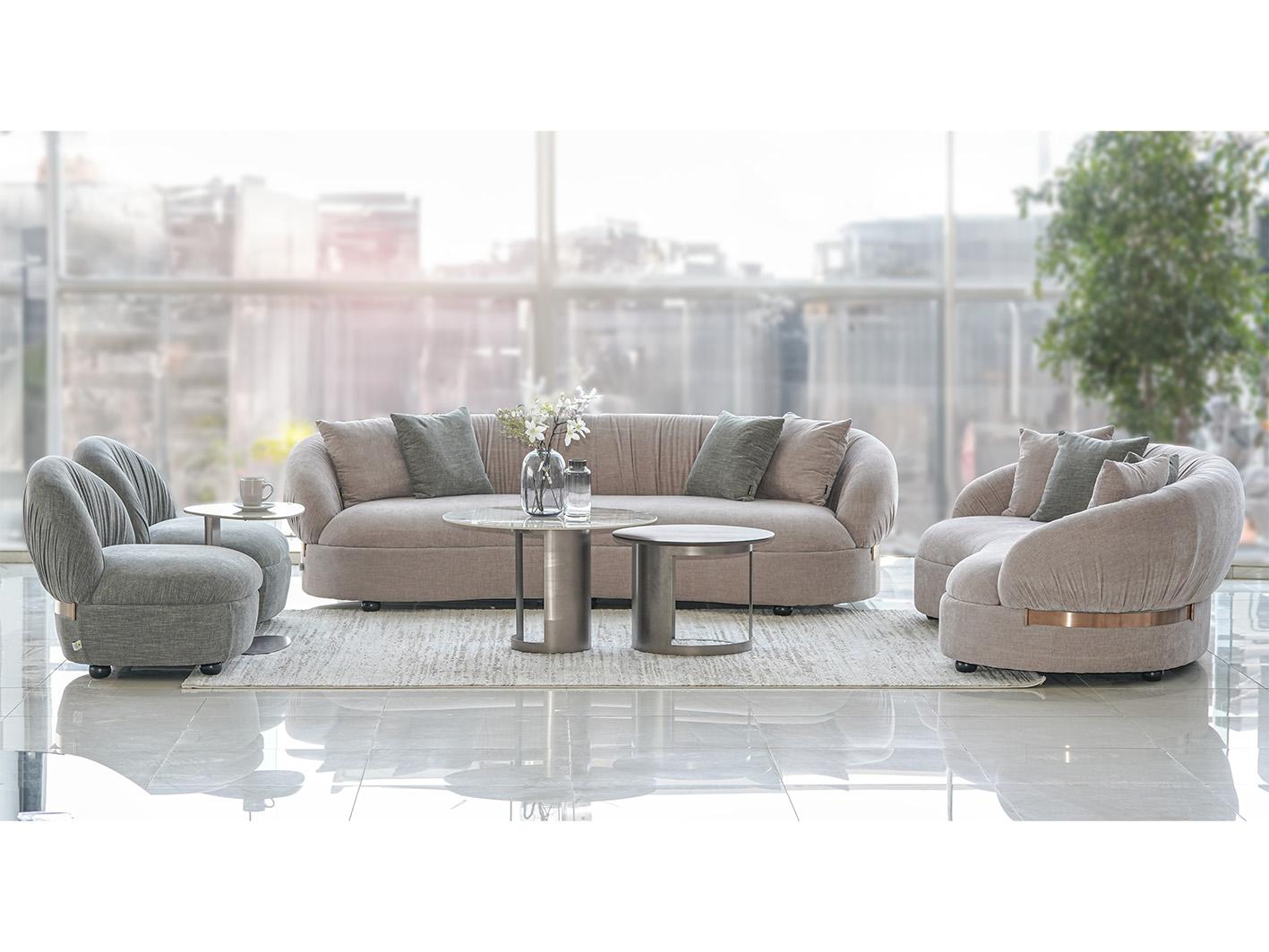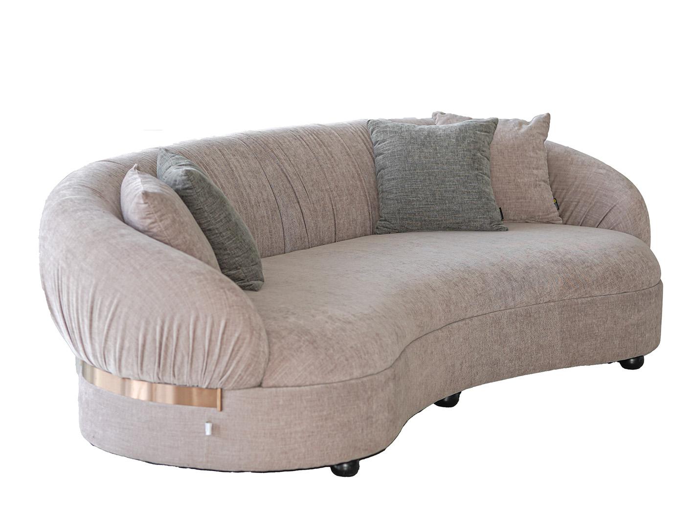 تتميز الكنبة بتصميمها المنحني الرائع الذي يضفي لمسة من الأناقة والجاذبية على أي مساحة. يمنح شكلها الانسيابي مظهراً راقياً يعزز جمالية ديكور غرفة المعيشة، مما يجعلها قطعة محورية تضفي طابعاً فخماً ومتناغماً في منزلك.