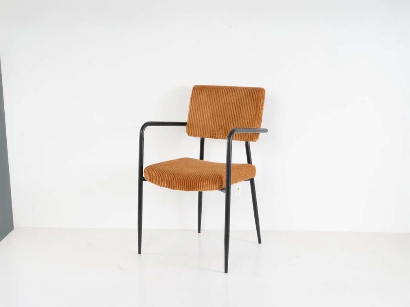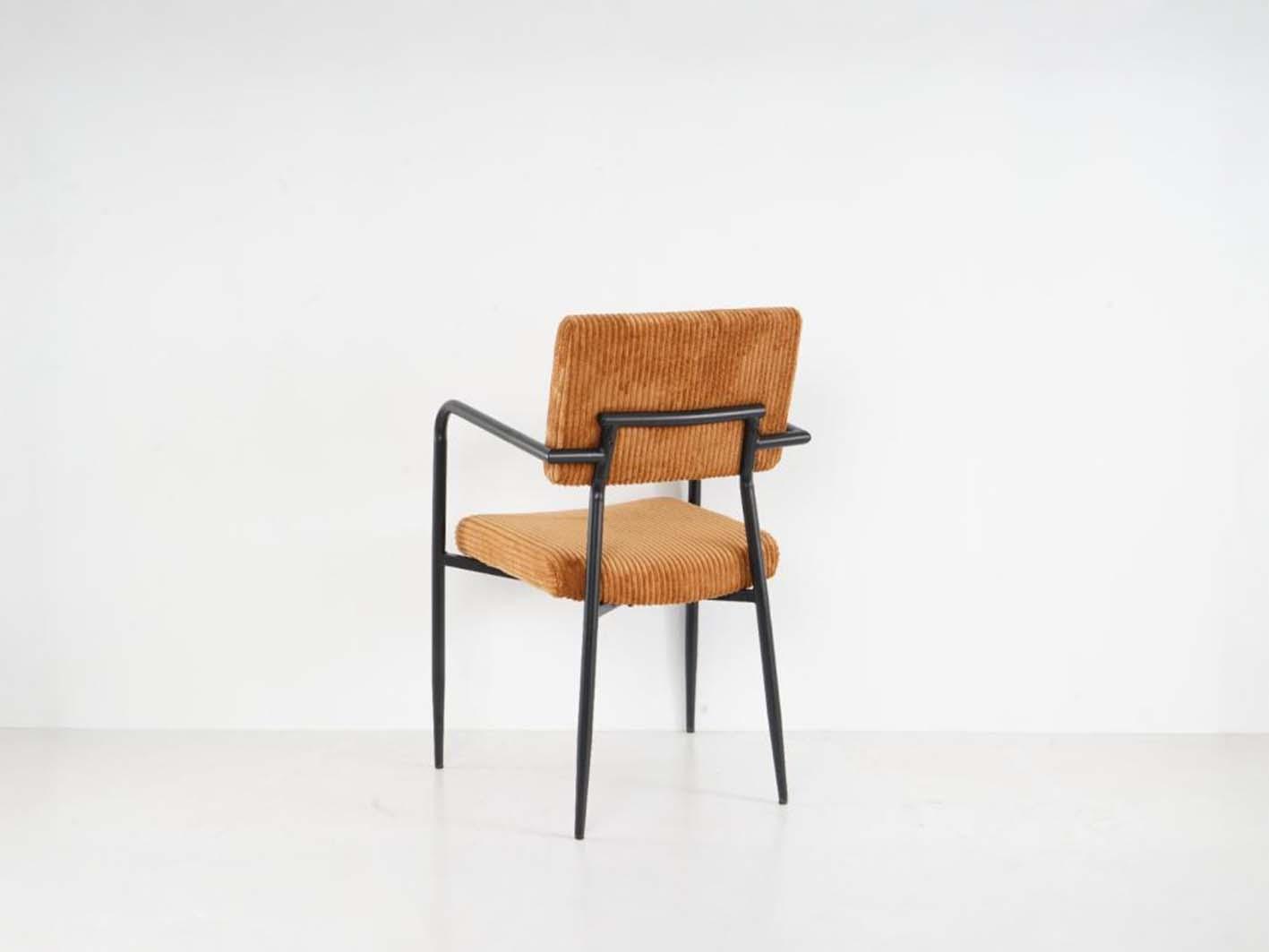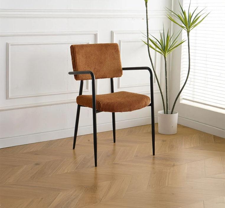 الإطار المعدني باللون الأسود يمنح الكرسي ثباتًا ومتانة، كما تضيف الأذرع الرفيعة تصميمًا عمليًا دون أن تثقل الشكل العام. الكرسي خفيف الوزن وسهل الحركة، مما يتيح تنقله بين الغرف حسب الحاجة دون عناء.