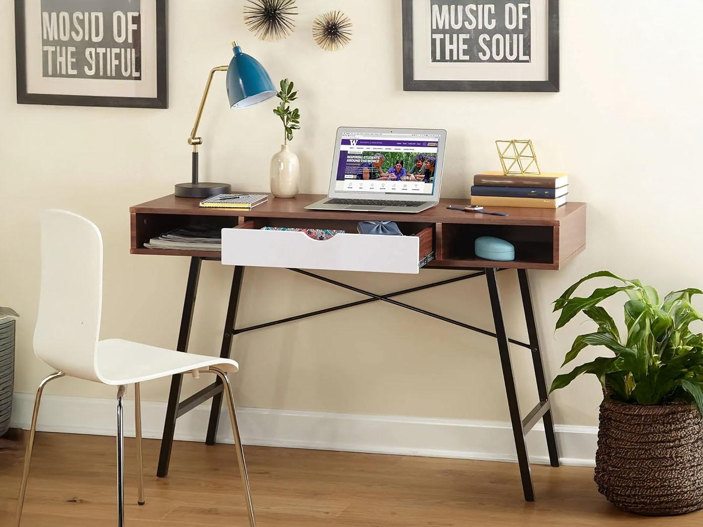 يحتوي المكتب على درج واحد لتخزين الأدوات والملفات المهمة، بالإضافة إلى رفّين مفتوحين للكتب أو العناصر الزخرفية، مما يساعدك على الحفاظ على ترتيب المكتب بسهولة.