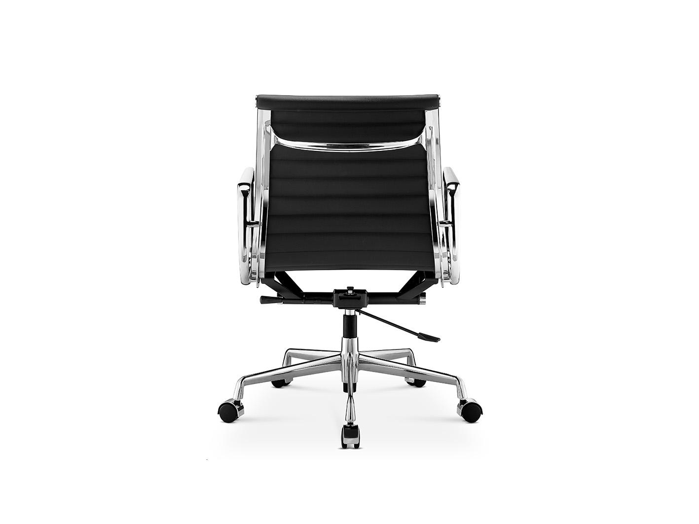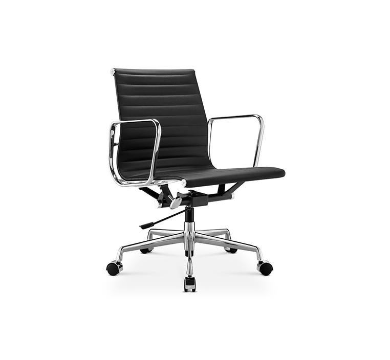 يأتي الكرسي بظهر متوسط الارتفاع مصنوع من إطار سبائك الألمنيوم المكروم ومغطى بتشطيب فاخر من جلد PU. هذا التصميم يمنح توازناً مثالياً بين الدعم المريح والمظهر العصري، مع لمسة خفيفة تناسب المساحات المكتبية الحديثة.
