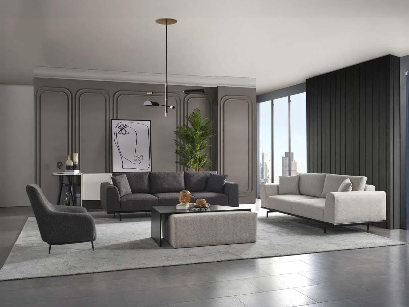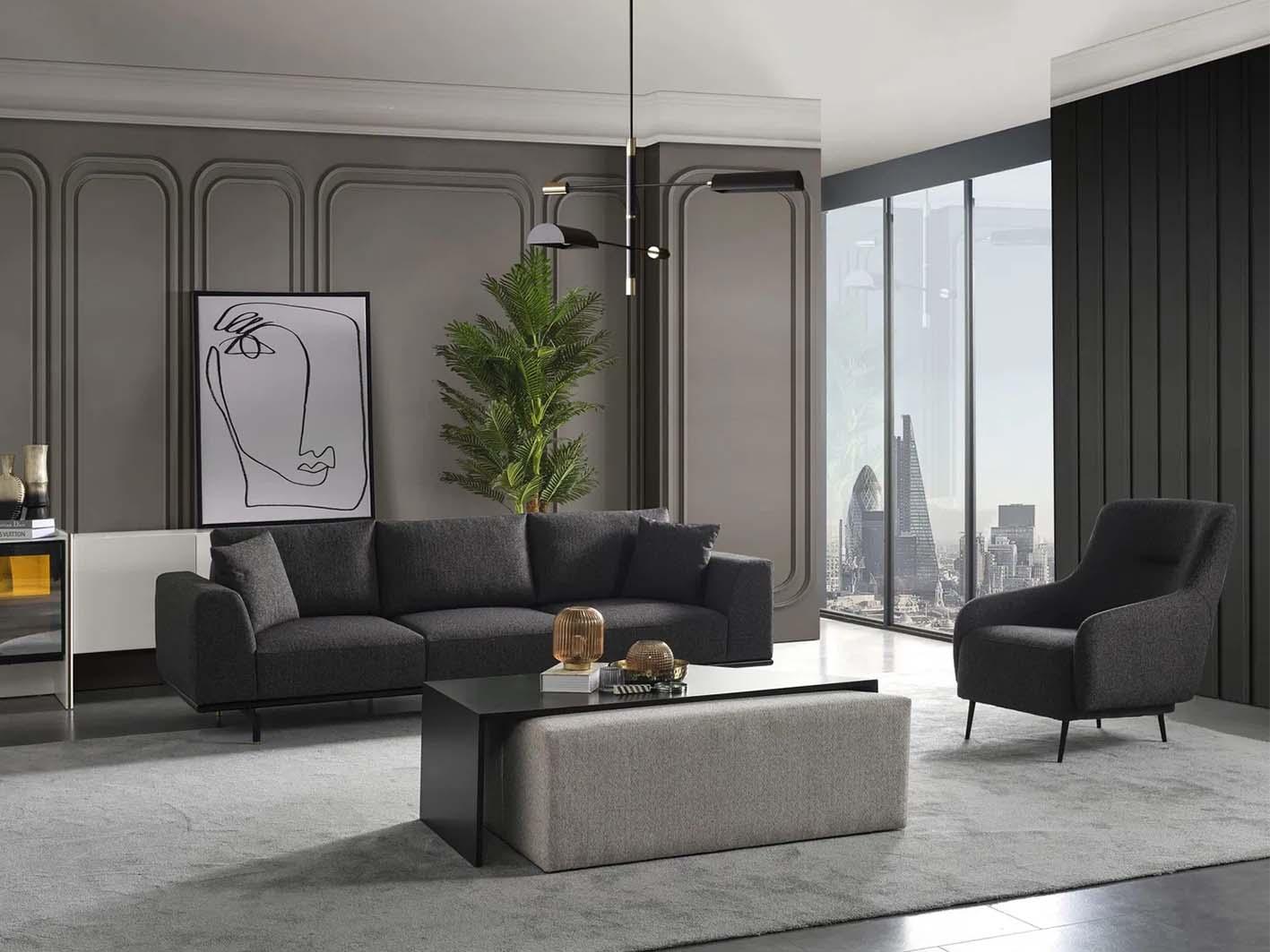 • الكنب مغطى بقماش فاخر يتميز بلمسة ناعمة ومظهر أنيق، بينما يضفي اللون الرمادي القاتم مظهراً راقياً يناسب جميع الديكورات.