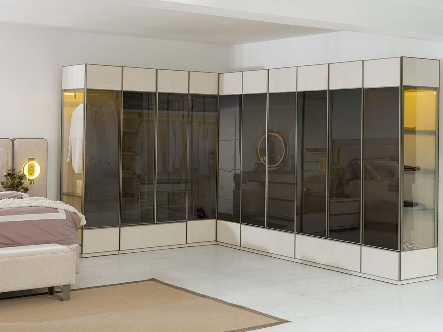 التشطيب الفاخر والألوان المحايدة تجعل الخزانة قطعة تتناغم مع أي ديكور داخلي، سواء كان عصريًا أو كلاسيكيًا، لتصبح جزءًا متكاملاً من تصميم الغرفة وتضفي لمسة من الرقي والذوق الرفيع.