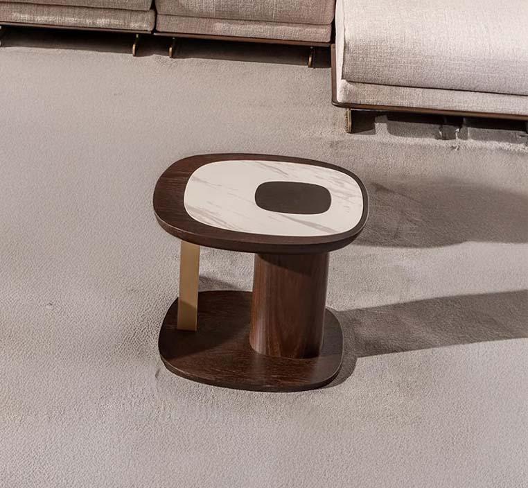 تتميز الطاولة الجانبية بسطح واسع ذي زوايا ناعمة وانحناءات أنيقة تضفي طابعًا انسيابيًا ينسجم بسهولة مع مختلف أنماط الديكور، سواء العصري أو الكلاسيكي. يتوسط السطح لمسة جمالية من الرخام الصناعي بلون أبيض مع تموجات رمادية جذابة، تنقسم بانسيابية مع الخشب البلوط بلونه البني ، مما يخلق تباينًا بصريًا فريدًا. كما تضيف القطعة الدائرية الصغيرة ذات اللون الداكن لمسة فنية تكمّل التصميم الراقي.