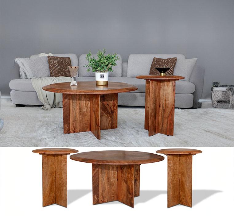 الطقم يتكون من طاولة رئيسية دائرية وطاولتين جانبيتين، مما يمنحك حرية الاستخدام حسب احتياجاتك.