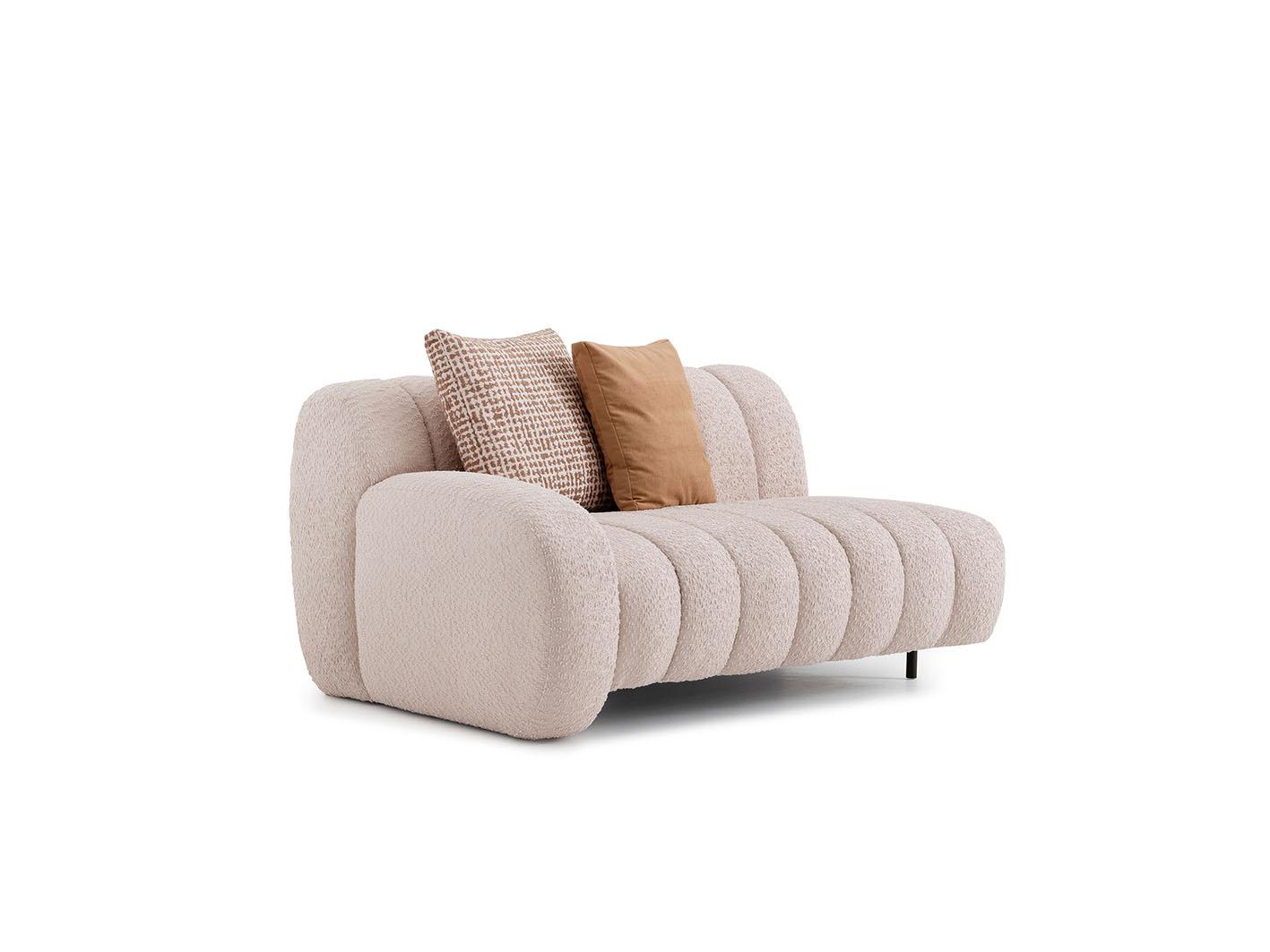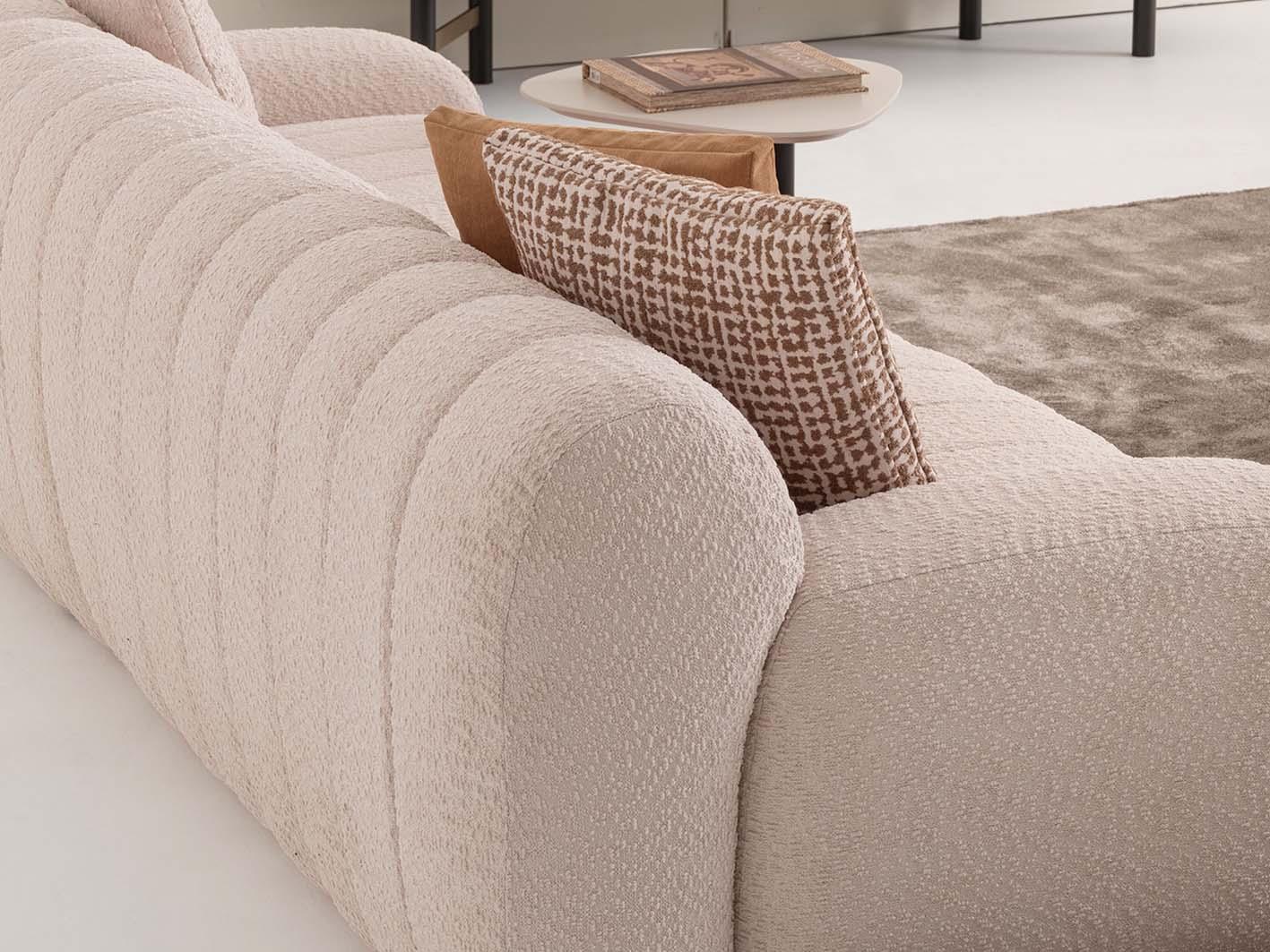 تم اختيار خامات التنجيد بعناية لتوفر ملمسًا فاخرًا وشعورًا ناعمًا عند كل استخدام. يتكوّن التنجيد من 80% قطن، 10% بوليستر، و10% بولي بروبلين، مما يمنح القماش نعومة طبيعية مع مقاومة عالية للتآكل والاستخدام اليومي. اللون البيج الأنيق يعزز من إحساس الراحة والدفء داخل المساحة.