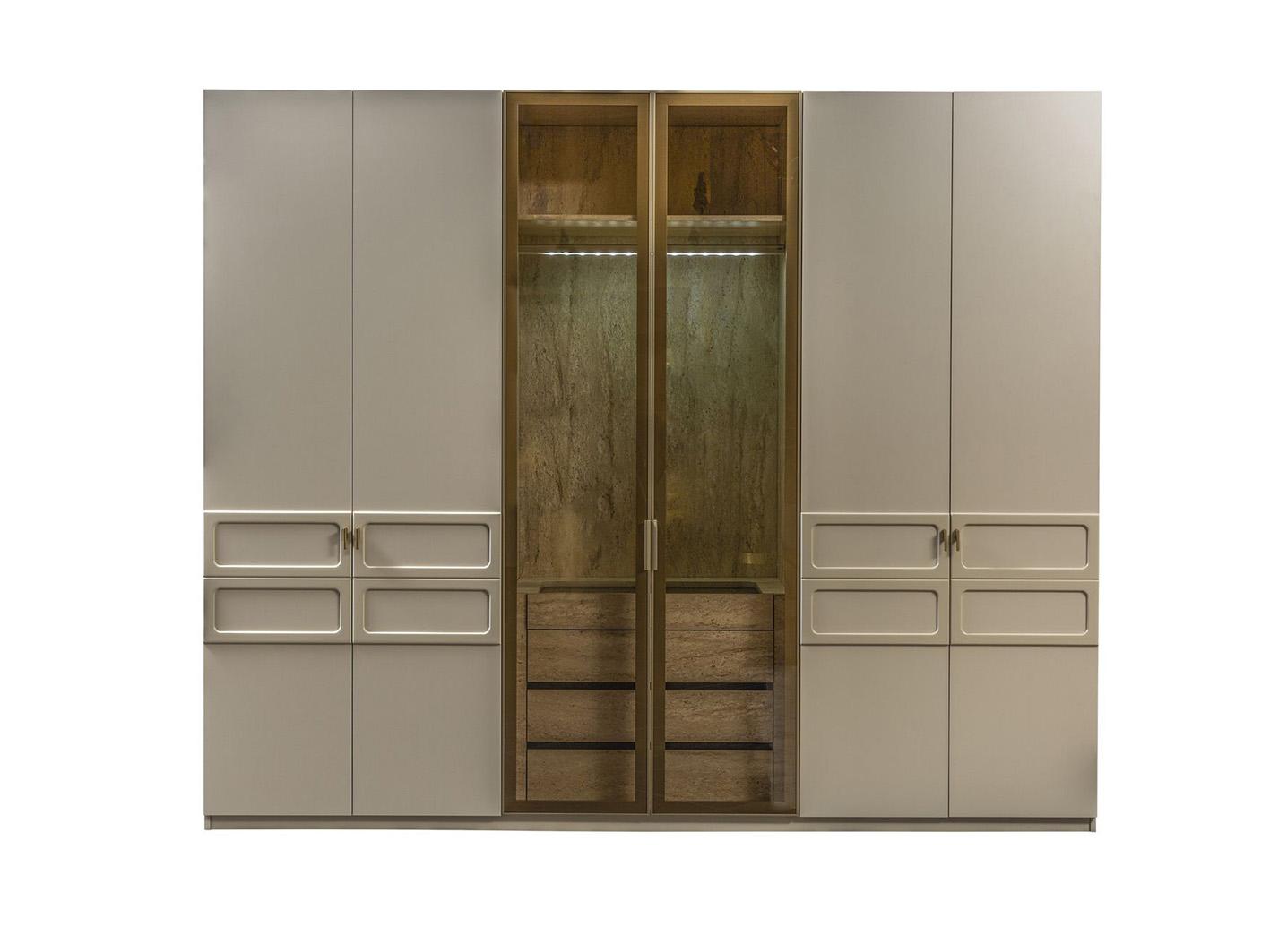 • المقابض المعدنية الذهبية والإطارات تضيف لمسة من الأناقة التي تجعل من هذه دواليب الملابس 6 أبواب  قطعة فريدة من نوعها. هذه التفاصيل الذهبية لا تقتصر فقط على الجمال، بل تعزز أيضًا من متانة الدولاب وسهولة استخدامه، مما يجعله إضافة مثالية لأي غرفة نوم.