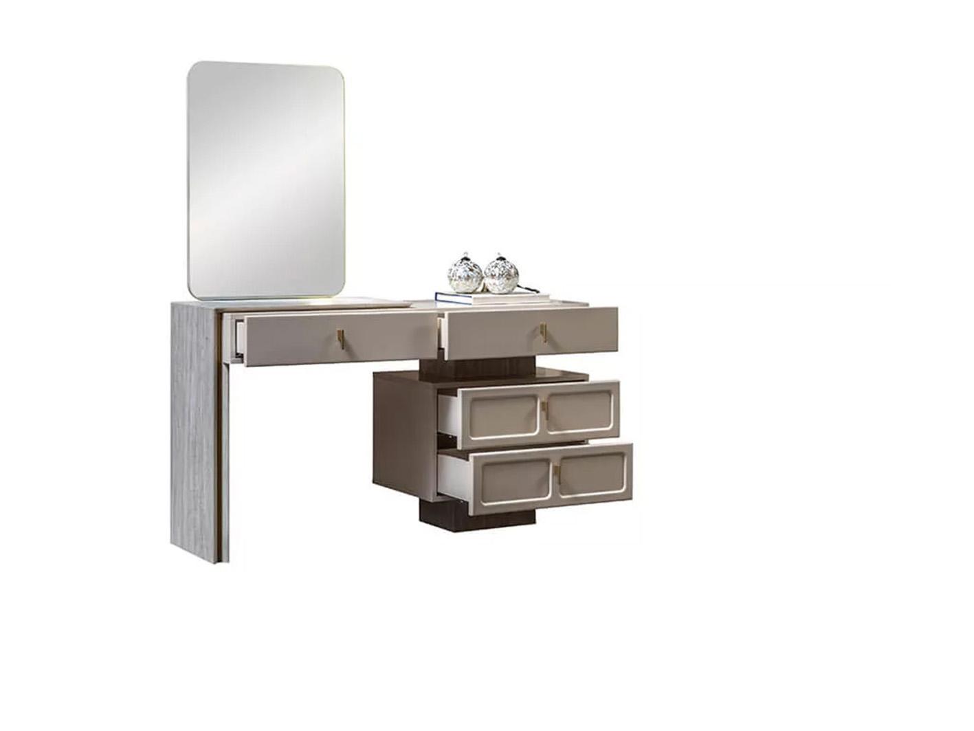 • وظائف متكاملة: يحتوي على طاولتي سرير جانبيتين، وحدة أدراج، وتسريحة مع مرآة.