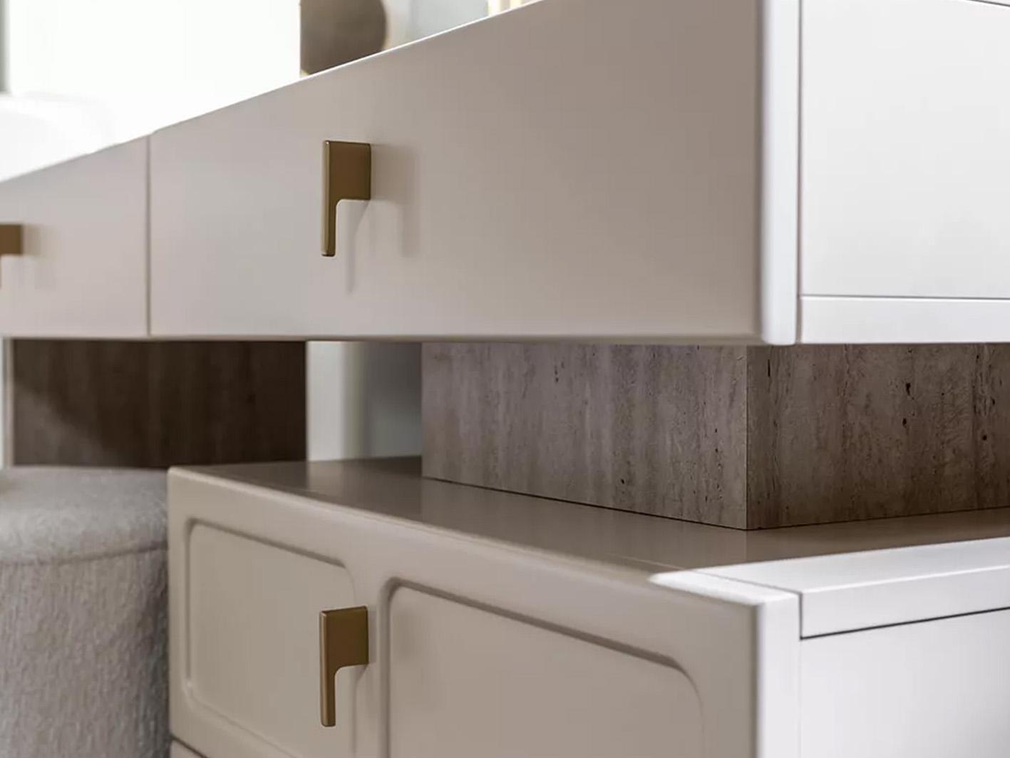 • تم تصنيع هذا الطقم من خشب MDF عالي الجودة، مع تشطيب ميلامين يجعله مقاومًا للرطوبة والحرارة والحشرات والسوائل، مما يضمن لك عمرًا طويلاً للطقم دون الحاجة للقلق بشأن الصيانة المستمرة. الأرجل المعدنية والمقابض الذهبية تعزز من متانة الطقم وتضفي لمسة راقية لا مثيل لها.