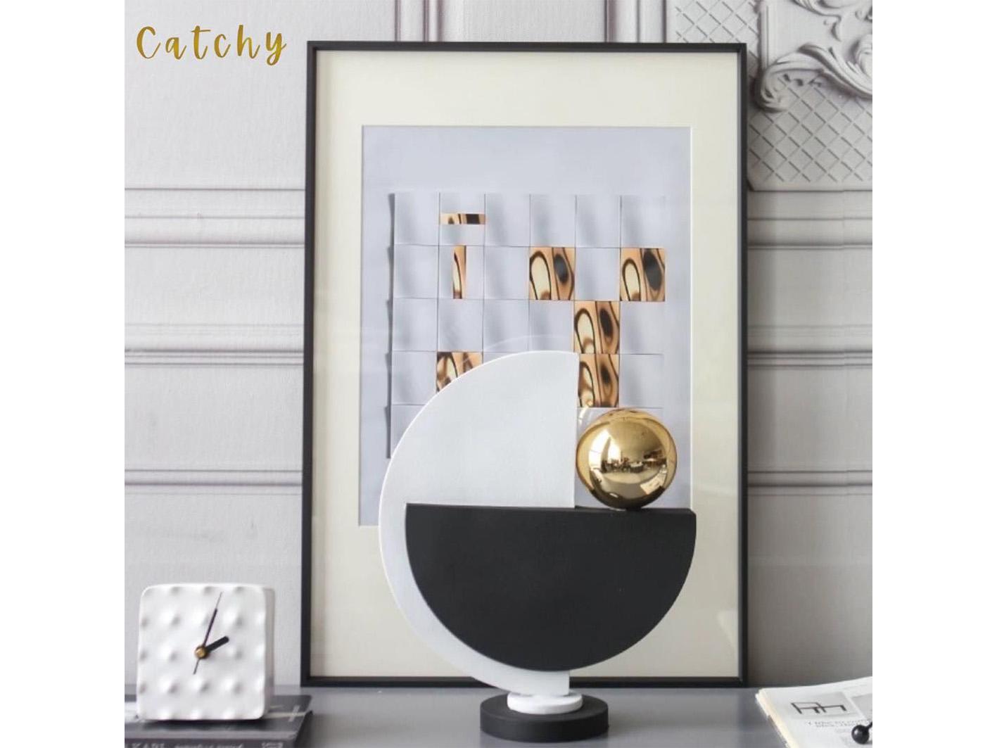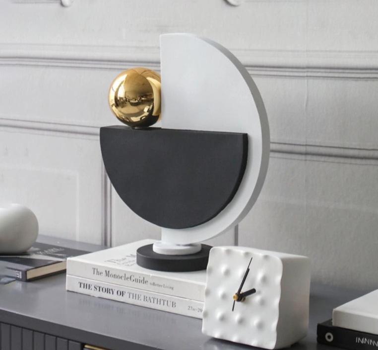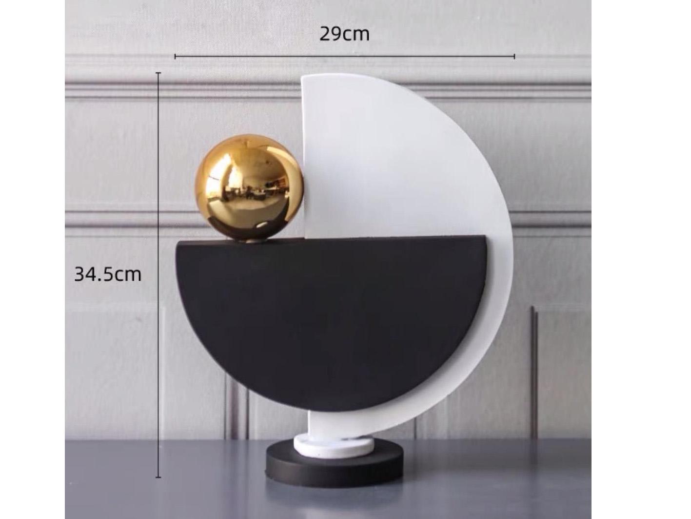 تعكس هذه القطعة الفنية الفريدة روحا مبتكرة واستثنائية في عالم الفن. تصميم الأشكال المتناقضة بين الأبيض والأسود والكرة الذهبية في الوسط يضفي على التمثال جمالا وتميزا. يمكن استخدامها كعنصر تزييني مذهل في أي مساحة داخلية، سواء كانت غرفة المعيشة أو المكتب أو حتى الممرات.