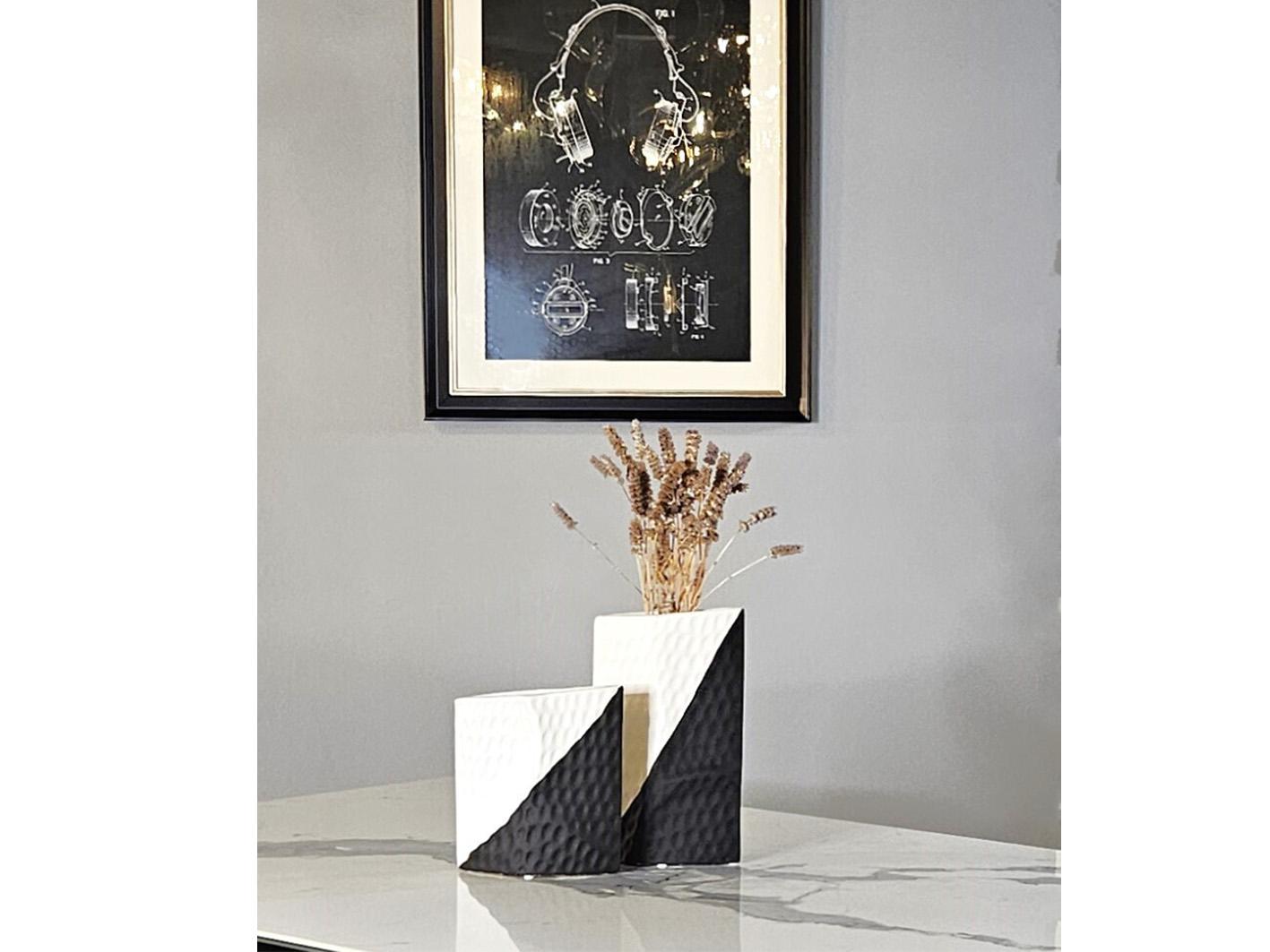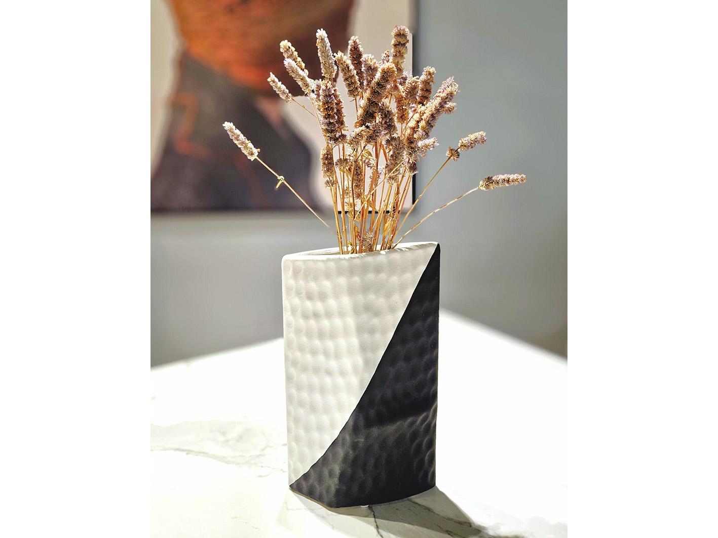 اكتشف جمال البساطة مع الفازة الأنيقة والفريدة هذه. تمتاز هذه الفازة بتصميمها الأنيق والحديث الذي يضفي لمسة ساحرة على أي مساحة توضع فيها. مصنوعة من مواد عالية الجودة، تتميز الفازة بتناغم الألوان الأبيض والأسود، مما يخلق تباينًا جميلاً يضفي لمسة من الأناقة الكلاسيكية على الديكور الخاص بك.