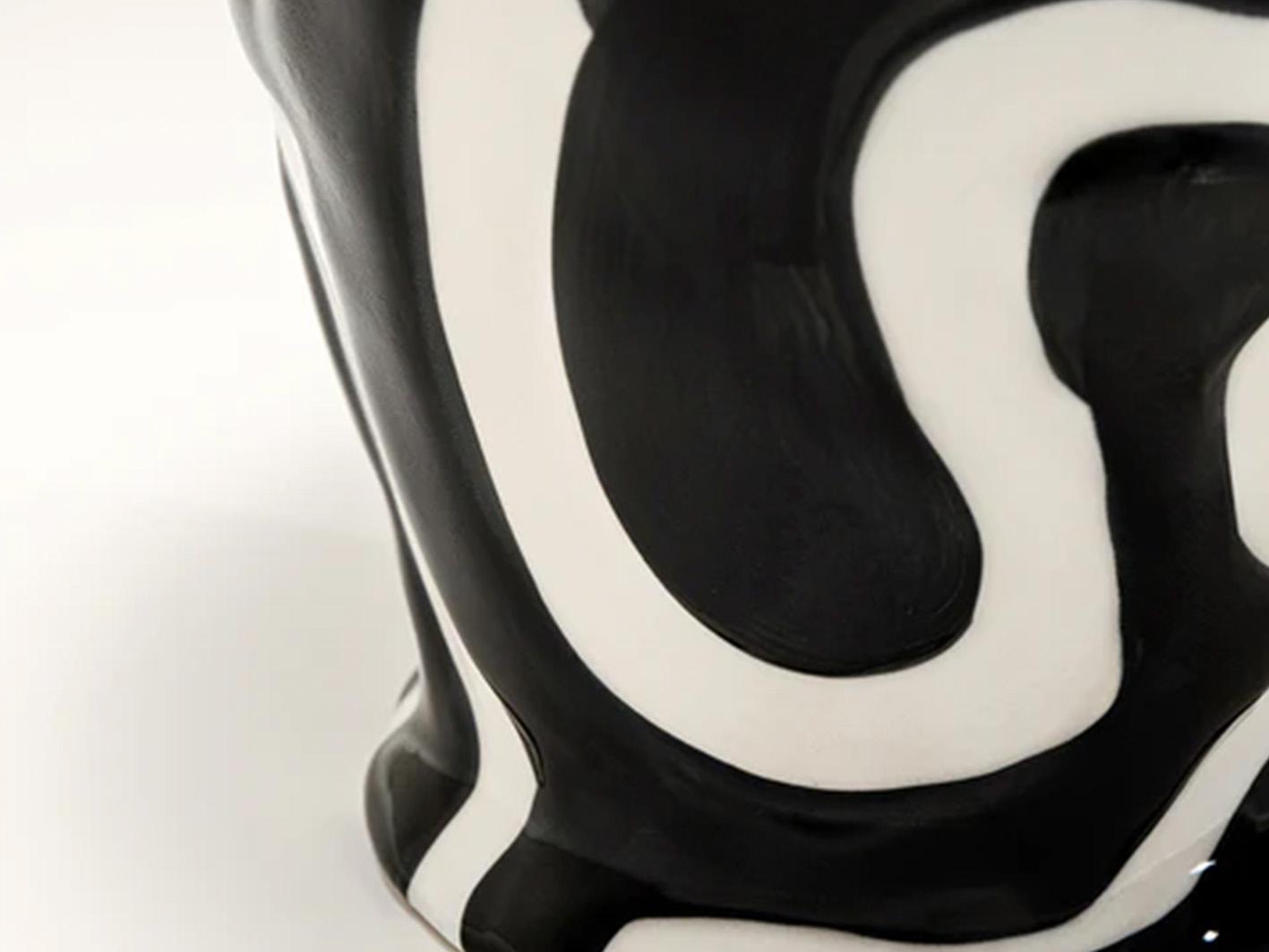 استمتع بجمال الفازة الأنيقة والفريدة من نوعها هذه. تتميز الفازة بتصميمها الملفت الذي يتميز بنمط ملتو باللونين الأبيض والأسود، والذي يضفي عليها جاذبية خاصة. تتسم الفازة أيضا بسطحها الناعم المميز حيث أنها مصنوعة من السيراميك الفاخر، مما يعطيها مظهرا فريدا ومميزا. تأتي الفازة بشكل مستدير مع فتحة واسعة في الأعلى وعنق ضيق، مما يمنحها مظهرا طويلا وأنيقا.اجعل هذه الفازة الرائعة تكون جزءًا من تجميعتك المنزلية أو هدية مميزة لشخص عزيز.