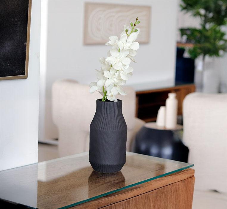 أضف لمسة من الفخامة العصرية إلى مساحتك مع هذه الفازة المصنوعة من السيراميك الفاخر باللون الأسود الأنيق. بتصميمها الانسيابي ، تضيف الفازة طابعًا مميزًا يناسب مختلف أنماط الديكور، سواءً الكلاسيكي أو الحديث. مثالية لتزيين الطاولات أو الأرفف، ويمكن استخدامها كقطعة مستقلة أو لحمل الأزهار الطبيعية أو الصناعية. خيار مثالي لعشاق الذوق الراقي والتفاصيل الدقيقة.