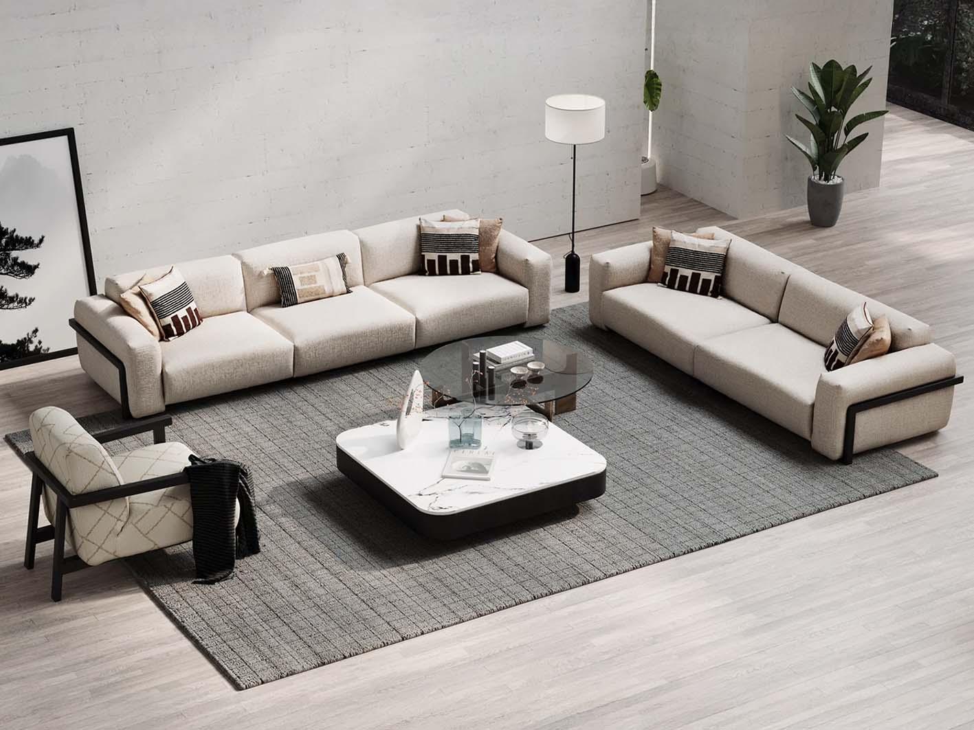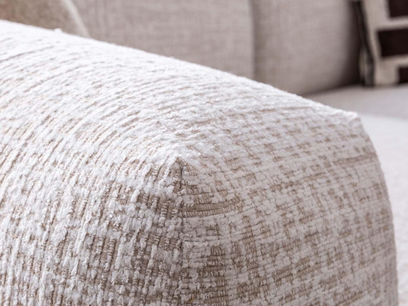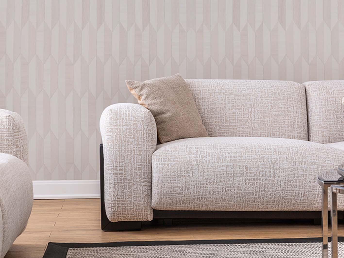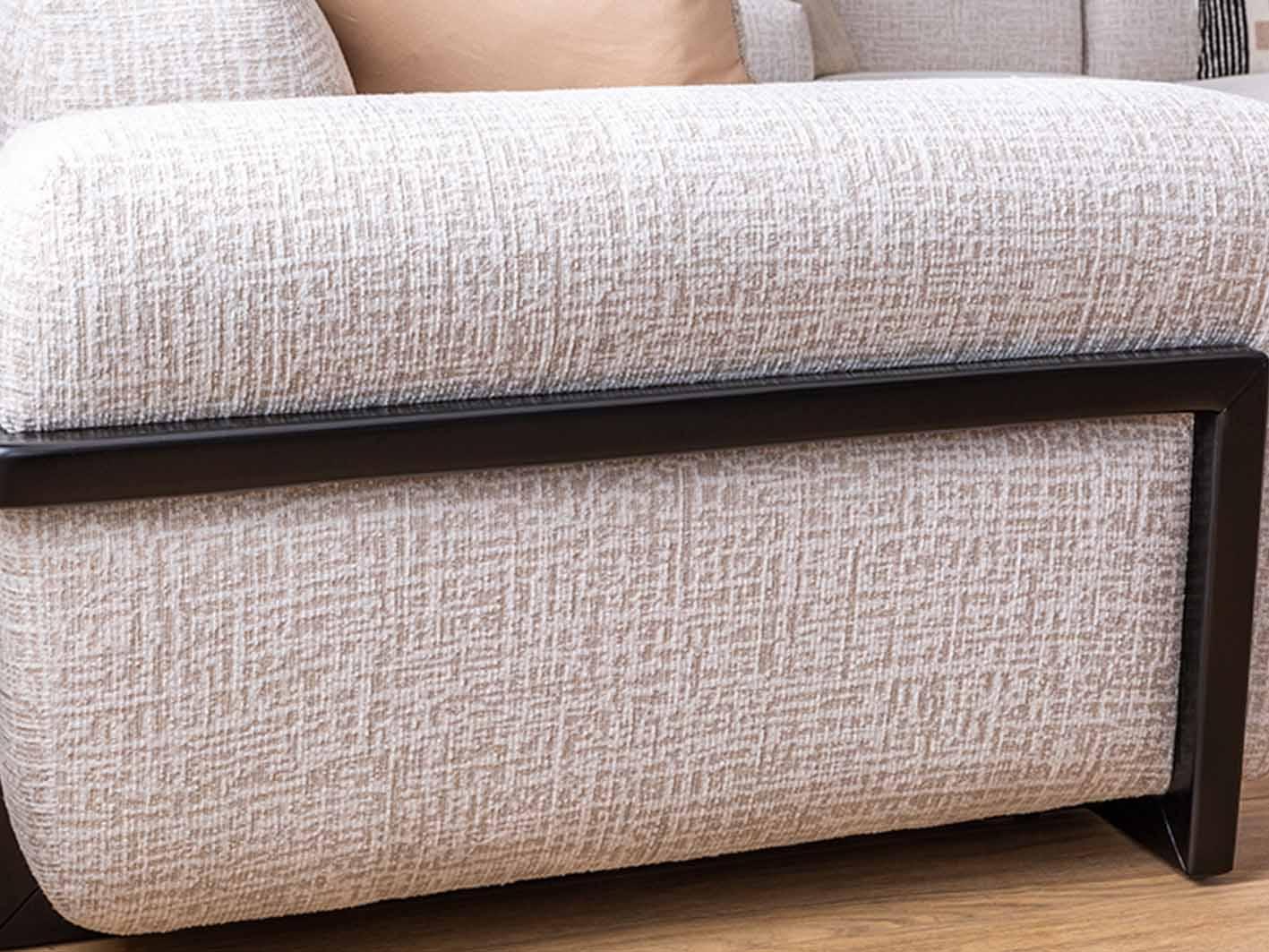 الهيكل الخارجي مصنوع من خشب متين يعزز من ثبات الكنبة واستدامتها، بينما تم تنجيدها بقماش بيج ناعم وراقي يسهل تنظيفه ويقاوم التآكل اليومي. الذراعان العريضان والظهر المرتفع يوفران دعماً مثالياً للجسم، ويضيفان لمسة من الفخامة الواضحة في كل زاوية من زوايا التصميم.