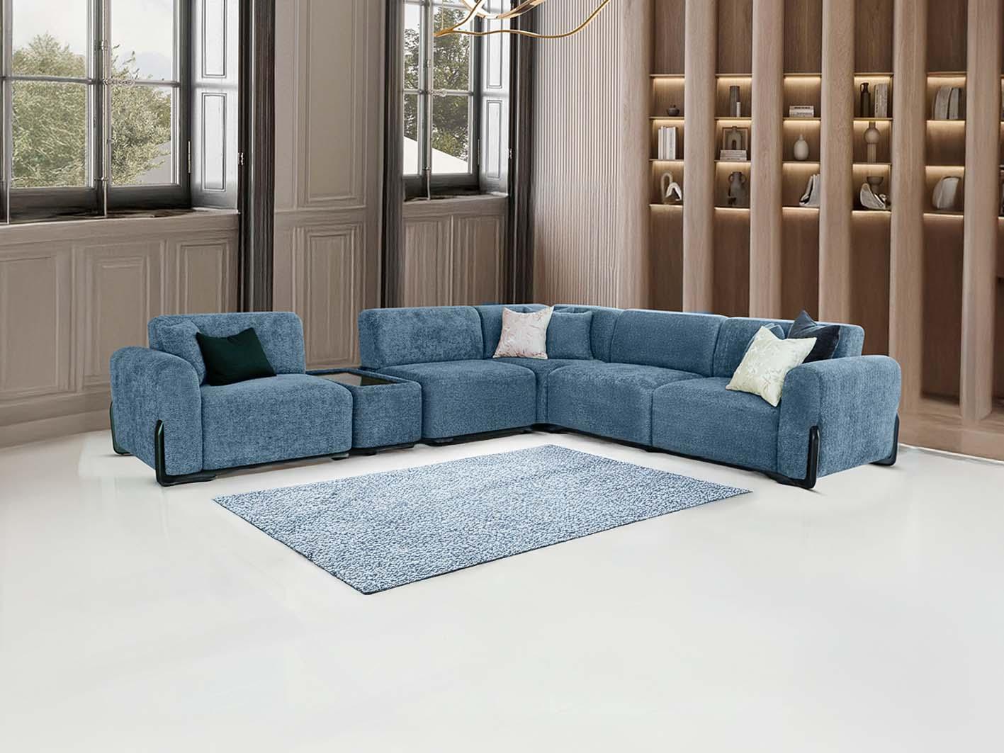 3. راحة فائقة مع تنجيد ناعم مُنجّد بقماش البوكلية الناعم الفاخر، الذي يتميز بنعومة ملمسه ومتانته، كما يأتي باللون الأزرق الأنيق الذي يضفي لمسة هادئة ودافئة على مساحتك الداخلية.