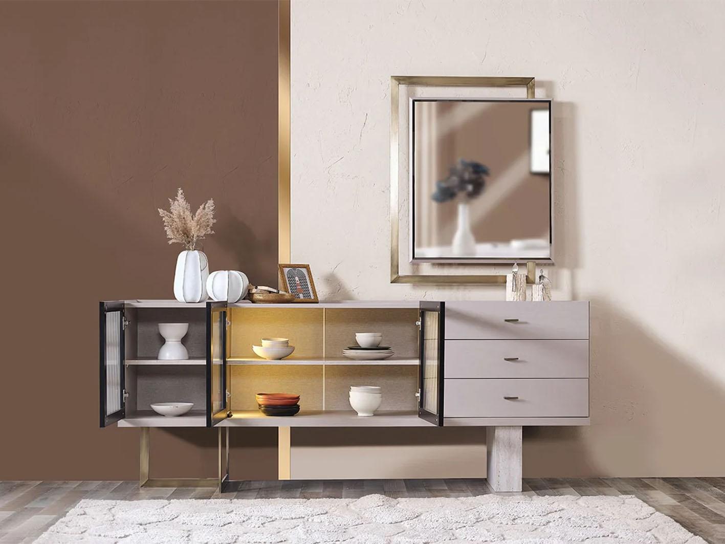 تأتي الإضاءة الداخلية لتبرز العناصر المخزنة بأسلوب جذاب، مما يمنح القطعة لمسة ساحرة ويضفي جواً من الفخامة إلى الغرفة.