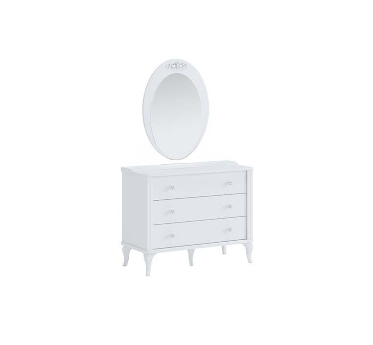 تضفي تسريحة جاسمين مع المرآة باللون الابيض لمسة من الفخامة والنعومة على غرفة النوم، بفضل تصميمها المميز الذي يجمع بين العملية والجمال. تتميز بتفاصيلها الدقيقة وجودة التصنيع العالية من الواح اخشاب الشيبورد مع تشطيب الميلامين المقاوم ، مما يجعلها الخيار المثالي لإضافة لمسة راقية ومنظمة إلى غرفتك.